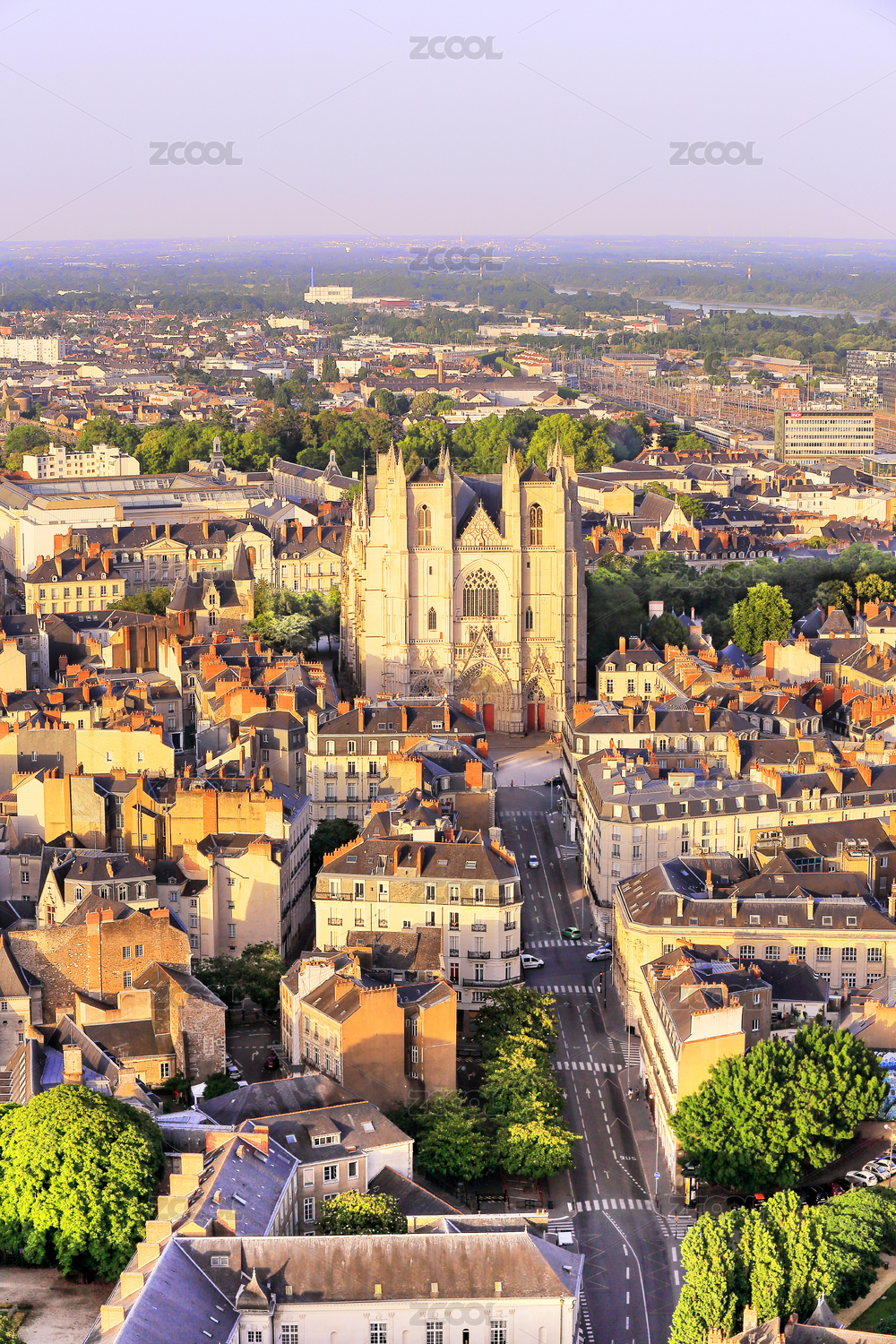 黃昏時(shí)分鳥(niǎo)瞰夕陽(yáng)映照下的法國(guó)南特城市建筑風(fēng)貌
