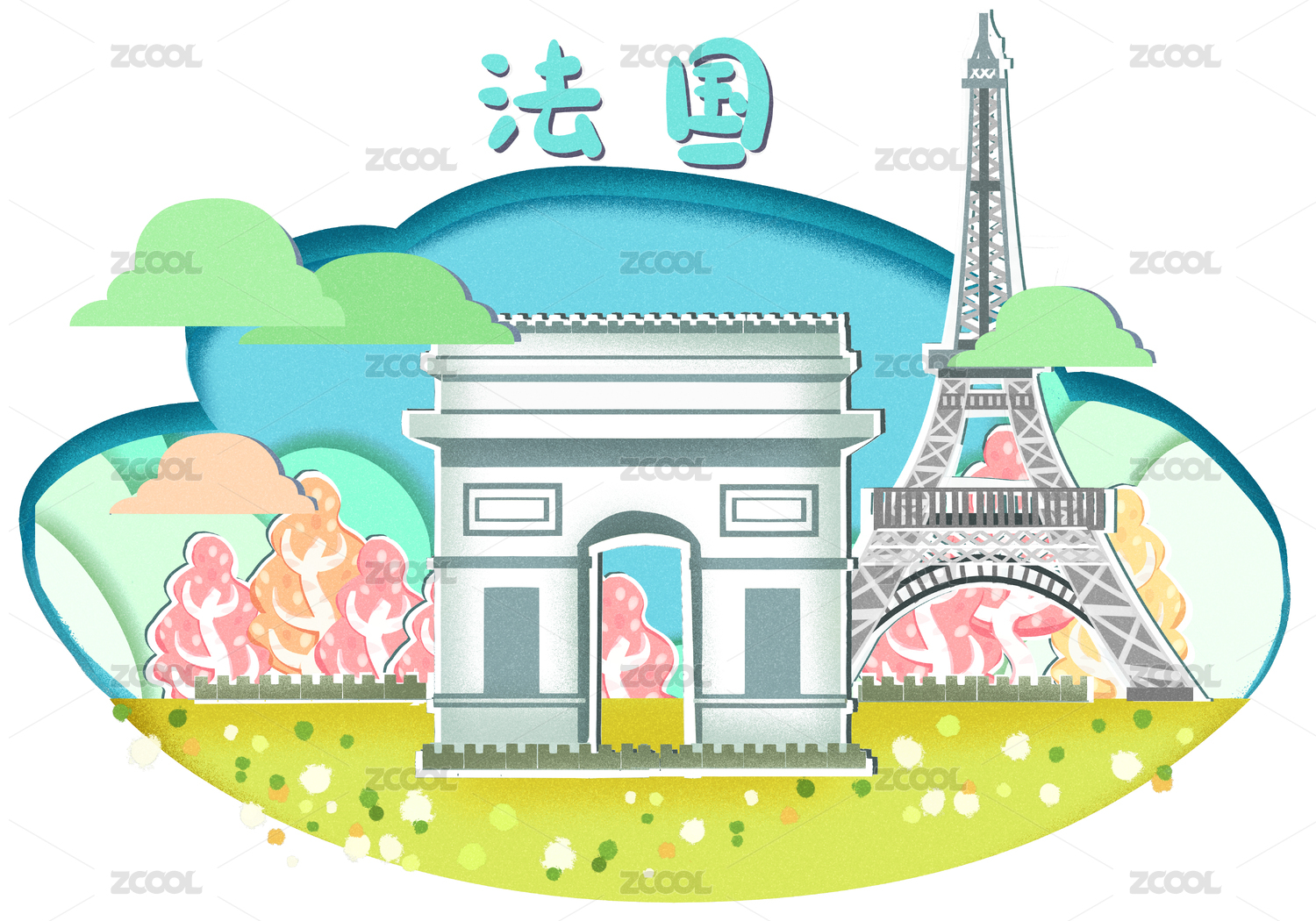 剪紙風(fēng)格法國(guó)巴黎地標(biāo)建筑凱旋門(mén)和艾菲爾鐵塔插畫(huà)