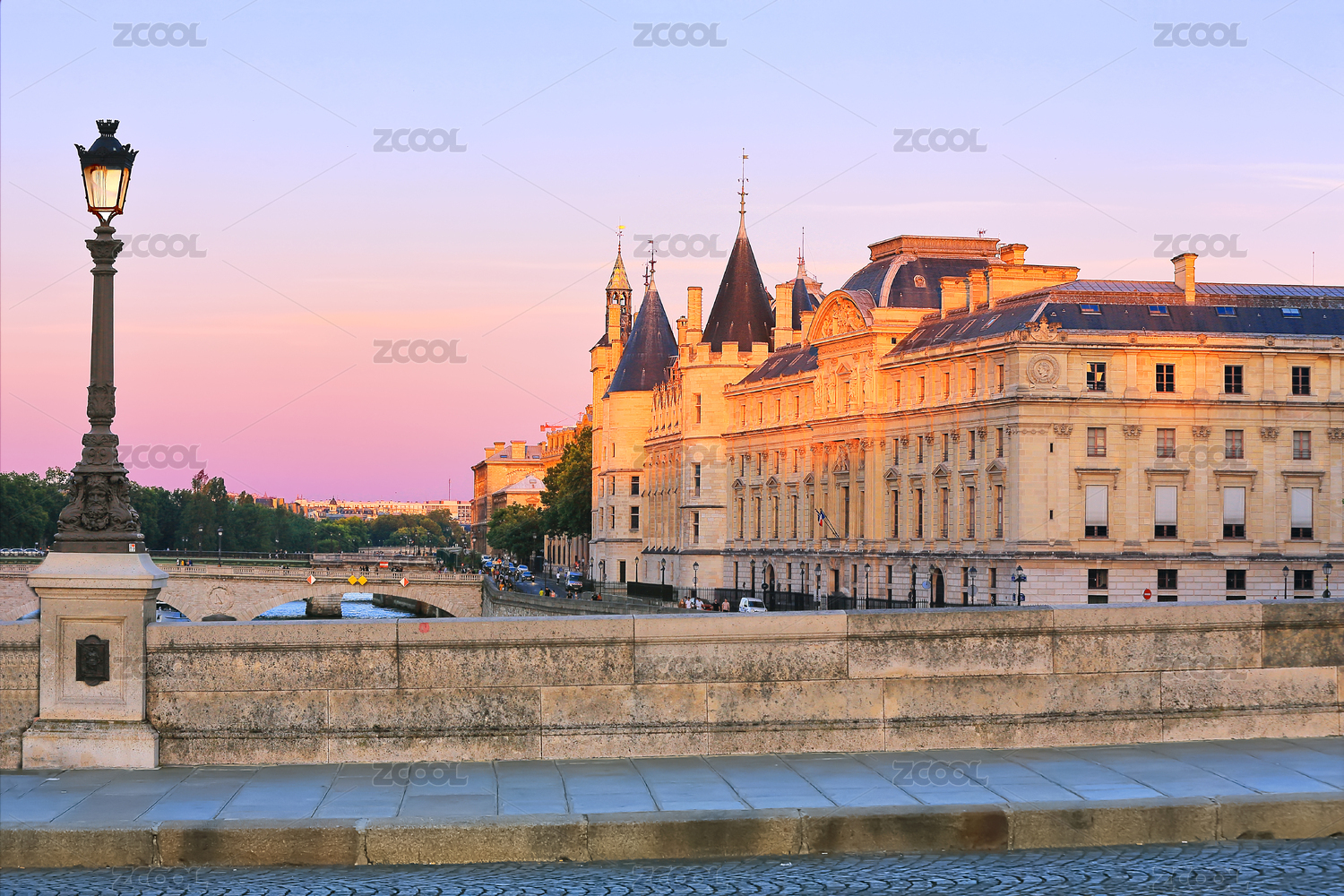 黃昏最后一抹夕陽(yáng)映照在法國(guó)巴黎塞納河新橋畔的古典建筑上