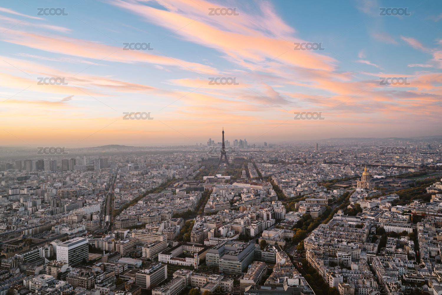 航拍黃昏的法國(guó)巴黎城市天際線全景風(fēng)光