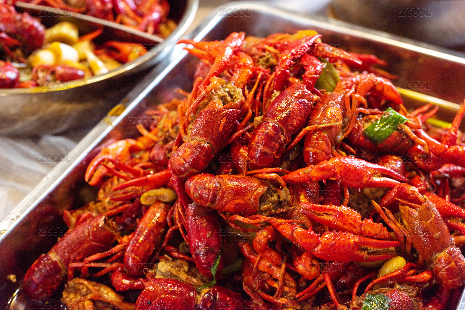 特色美食麻辣小龍蝦盛放在不銹鋼大盆里