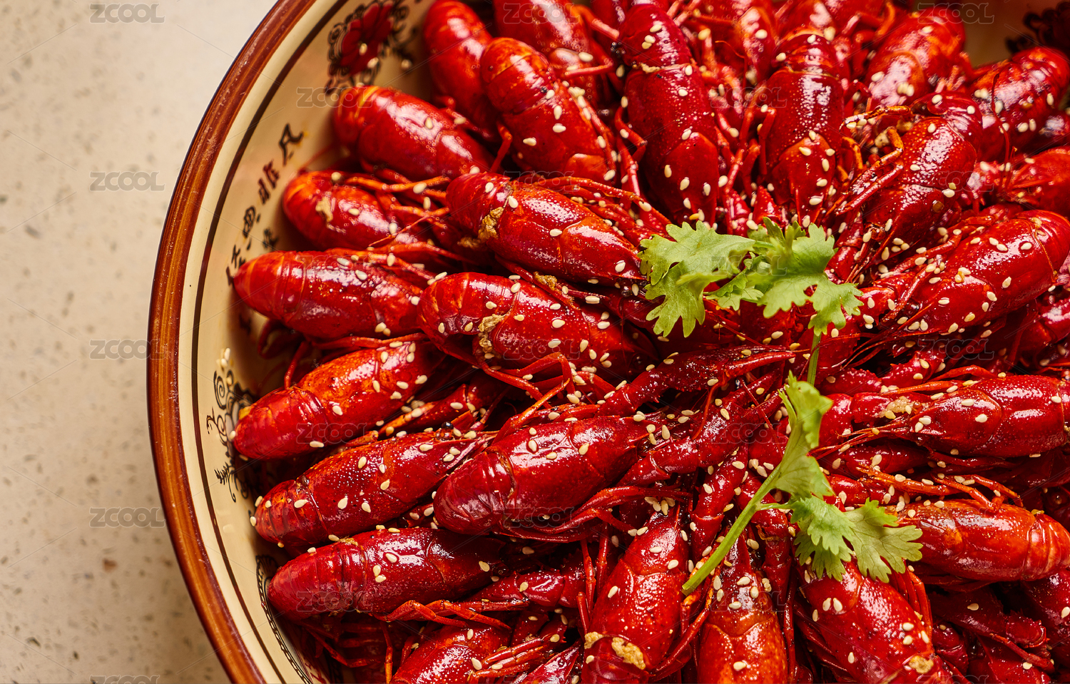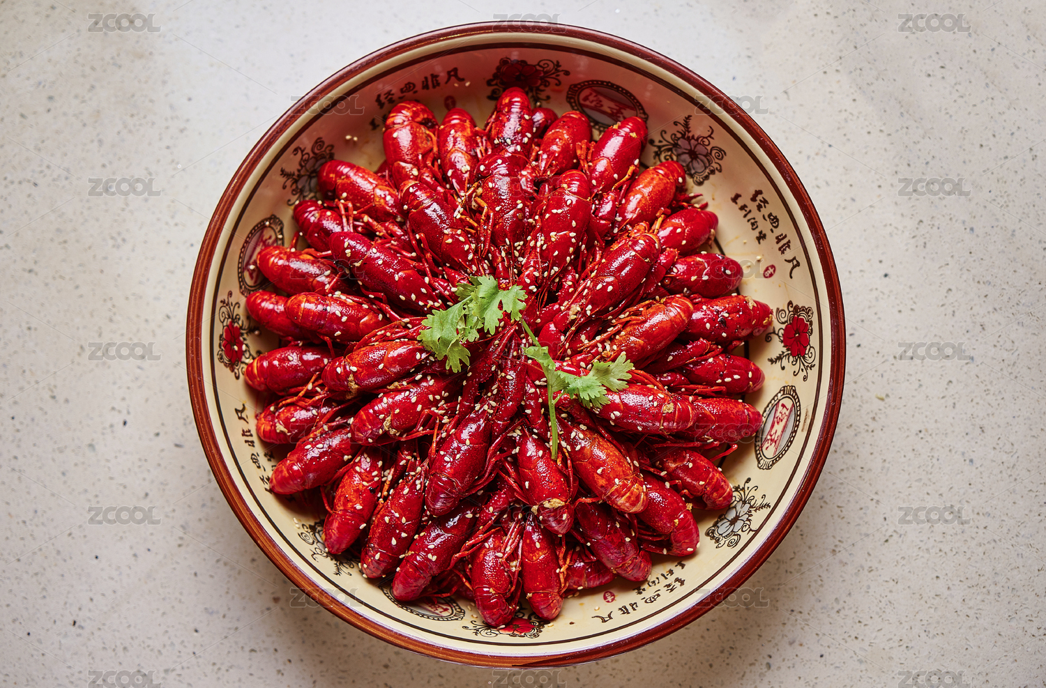特色美食麻辣小龍蝦整齊的擺放在大瓷碗中