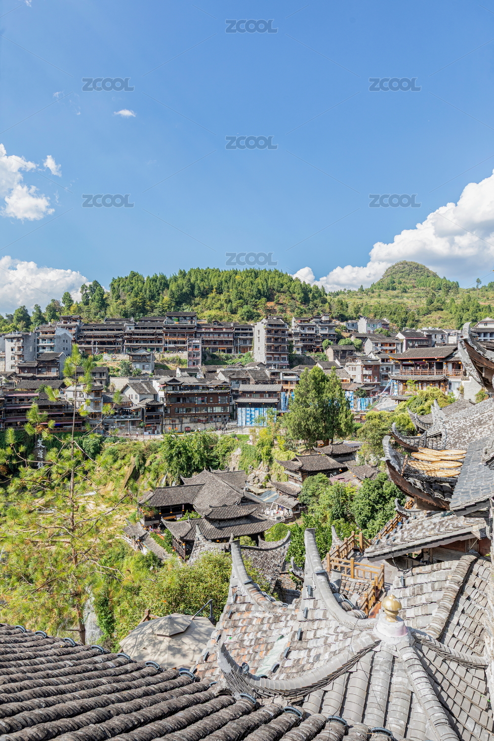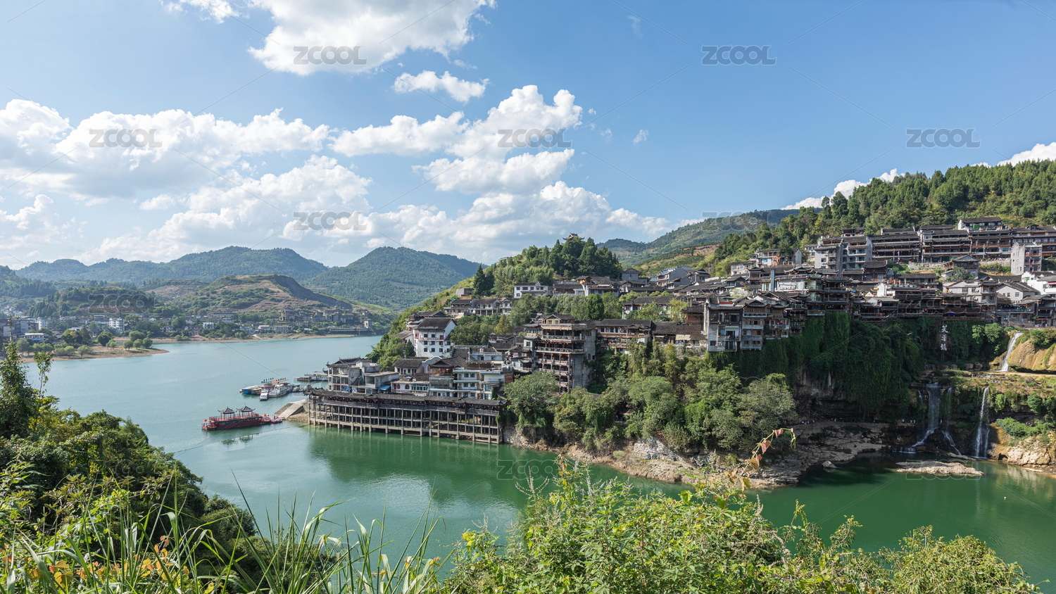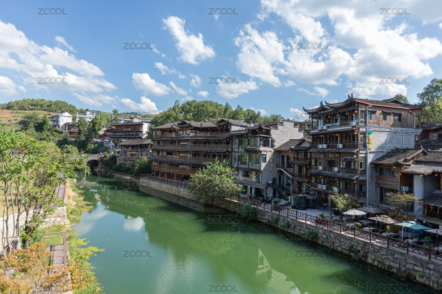 湖南湘西芙蓉鎮(zhèn)河畔古雅民居映藍(lán)天碧水