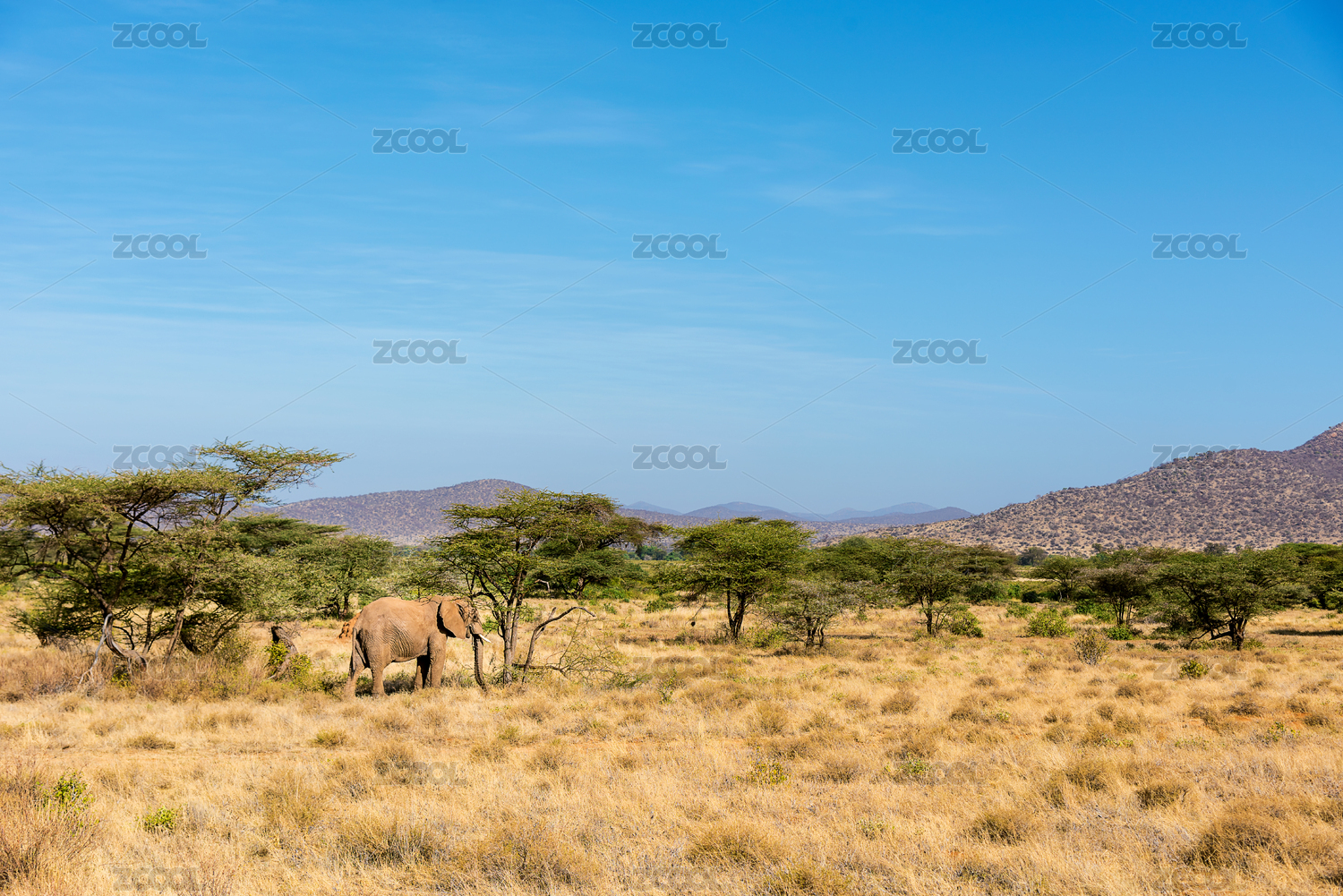 非洲大象行走在廣袤的大草原上遠(yuǎn)處有一些山