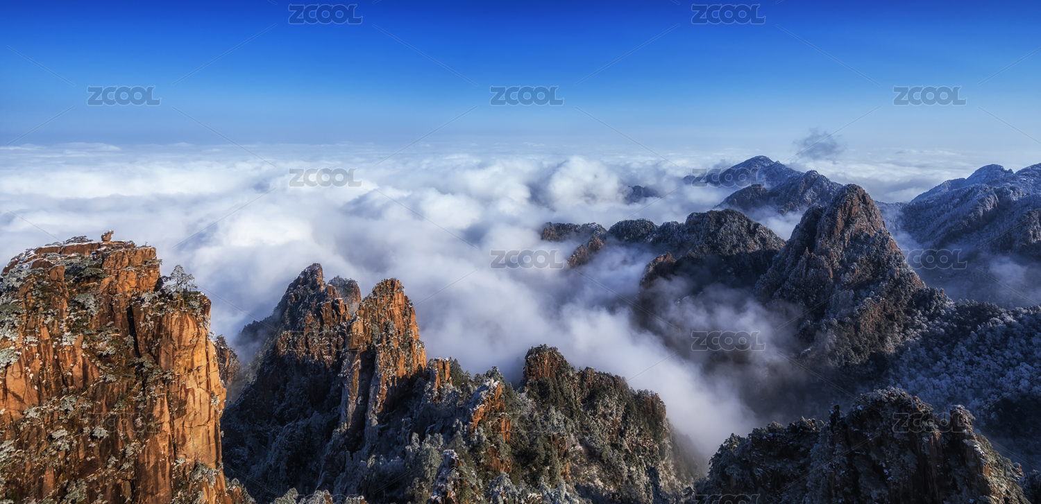中國(guó)安徽黃山冬季晴天早上的猴子觀海景點(diǎn)