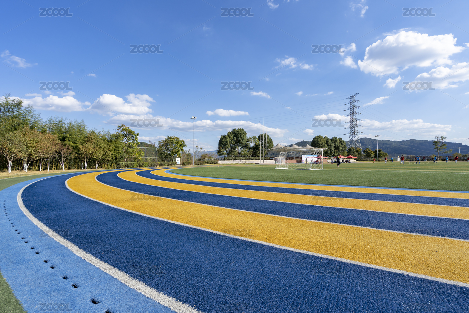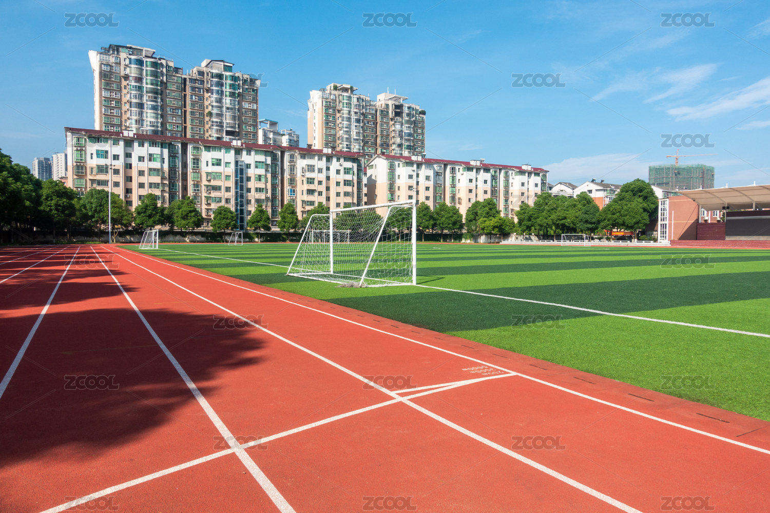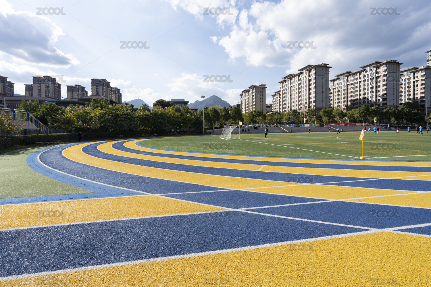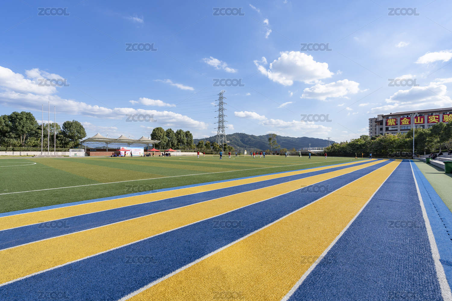 晴朗天氣下操場內(nèi)的塑膠跑道與足球場