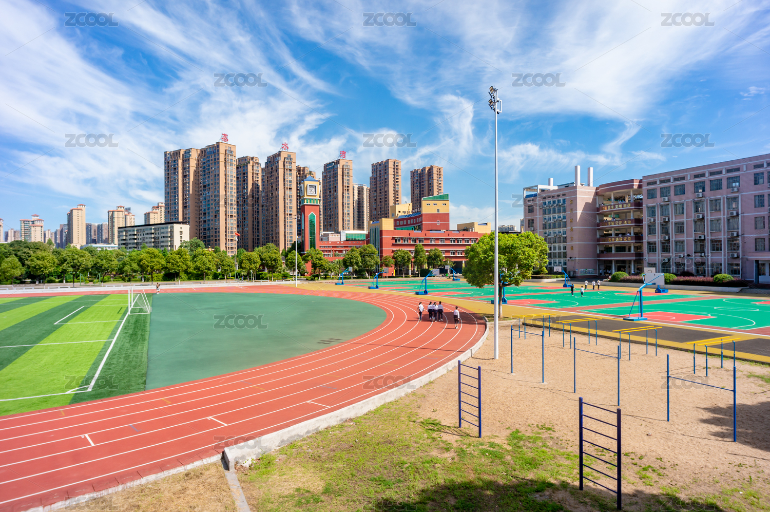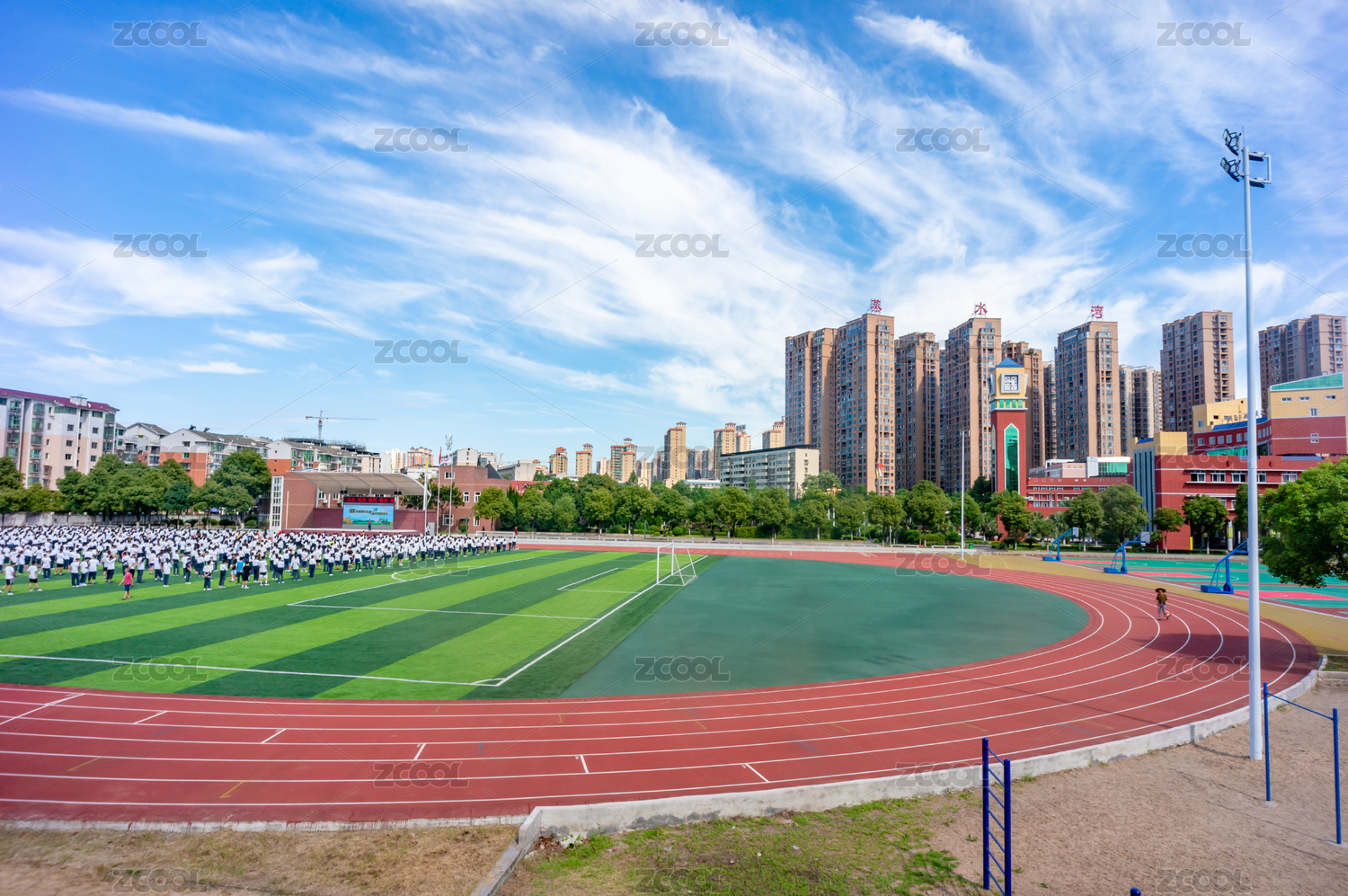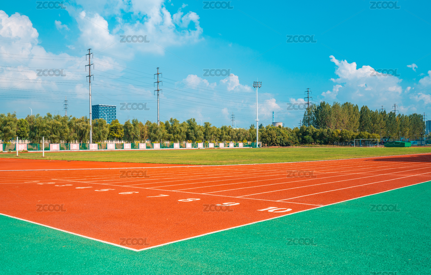 晴朗天氣下操場內(nèi)的塑膠跑道與足球場