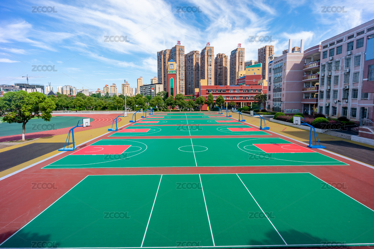 藍(lán)天白云下學(xué)校里畫有黃藍(lán)兩色跑道的操場