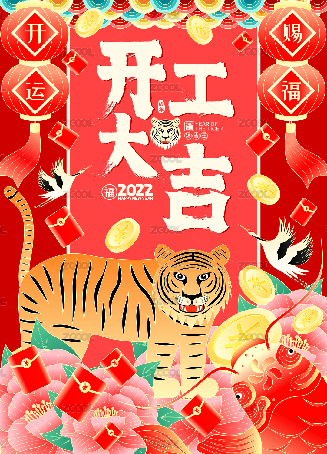 開工大吉國潮錦鯉開運(yùn)老虎牡丹送福春節(jié)海報(bào)