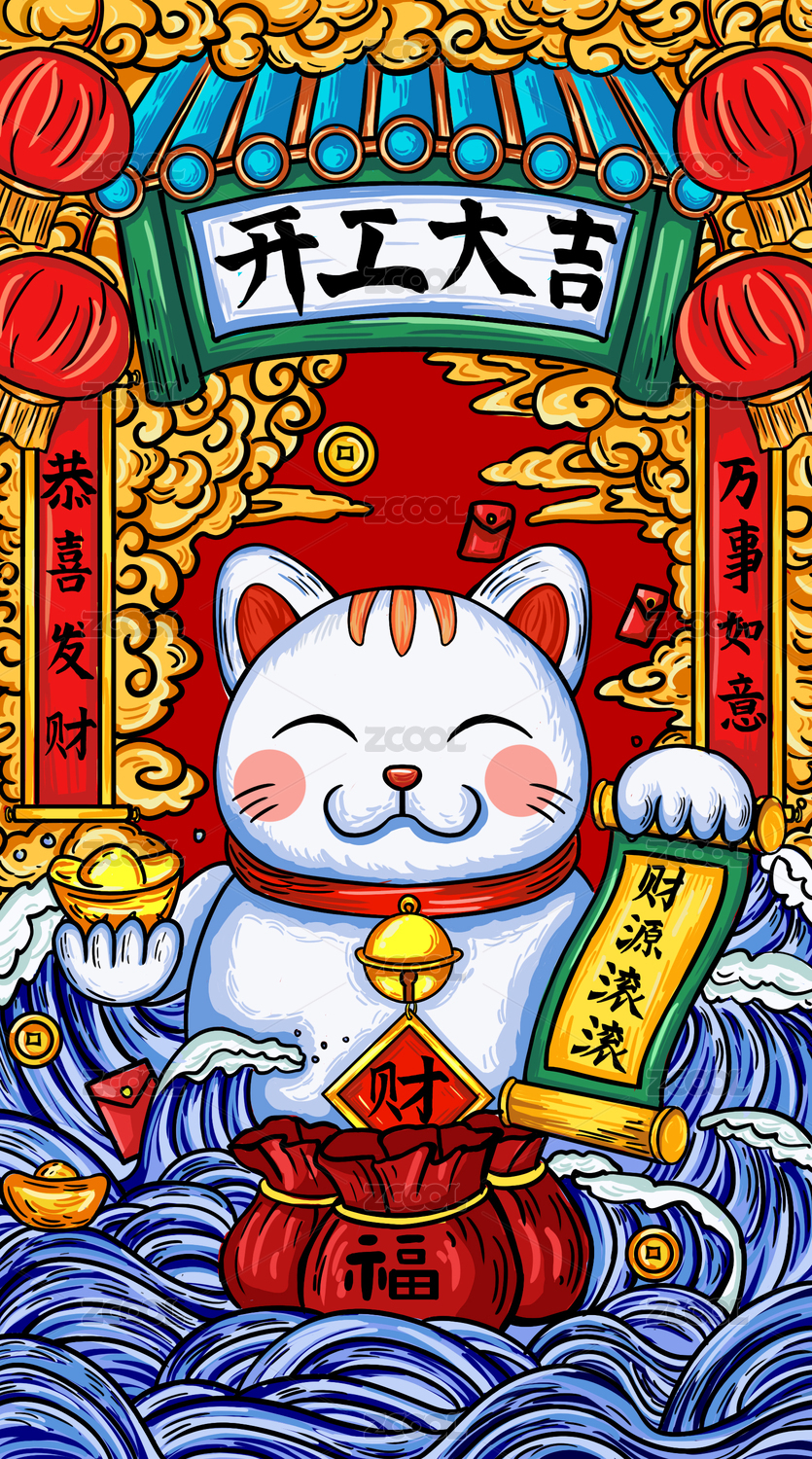 國潮開工大吉瑞虎鳳凰呈祥錦鯉旺運(yùn)紅包插畫