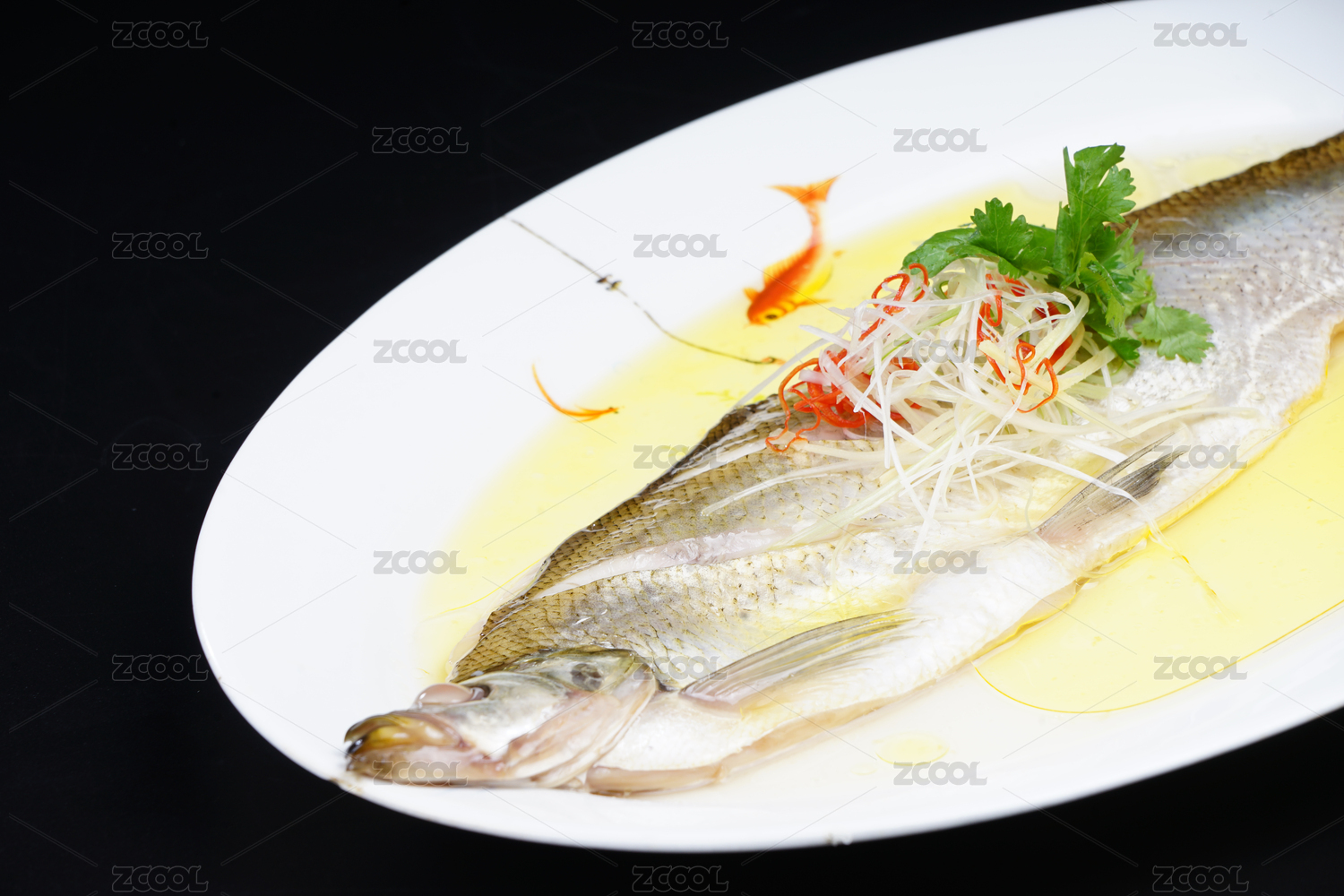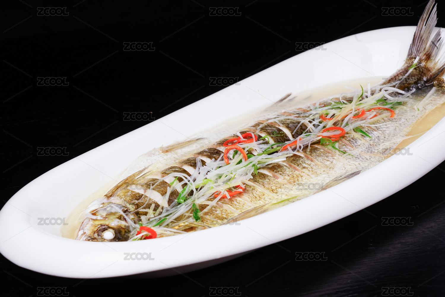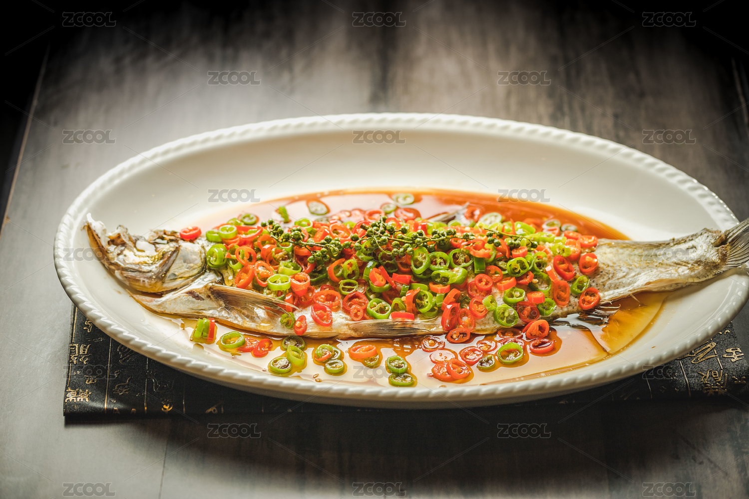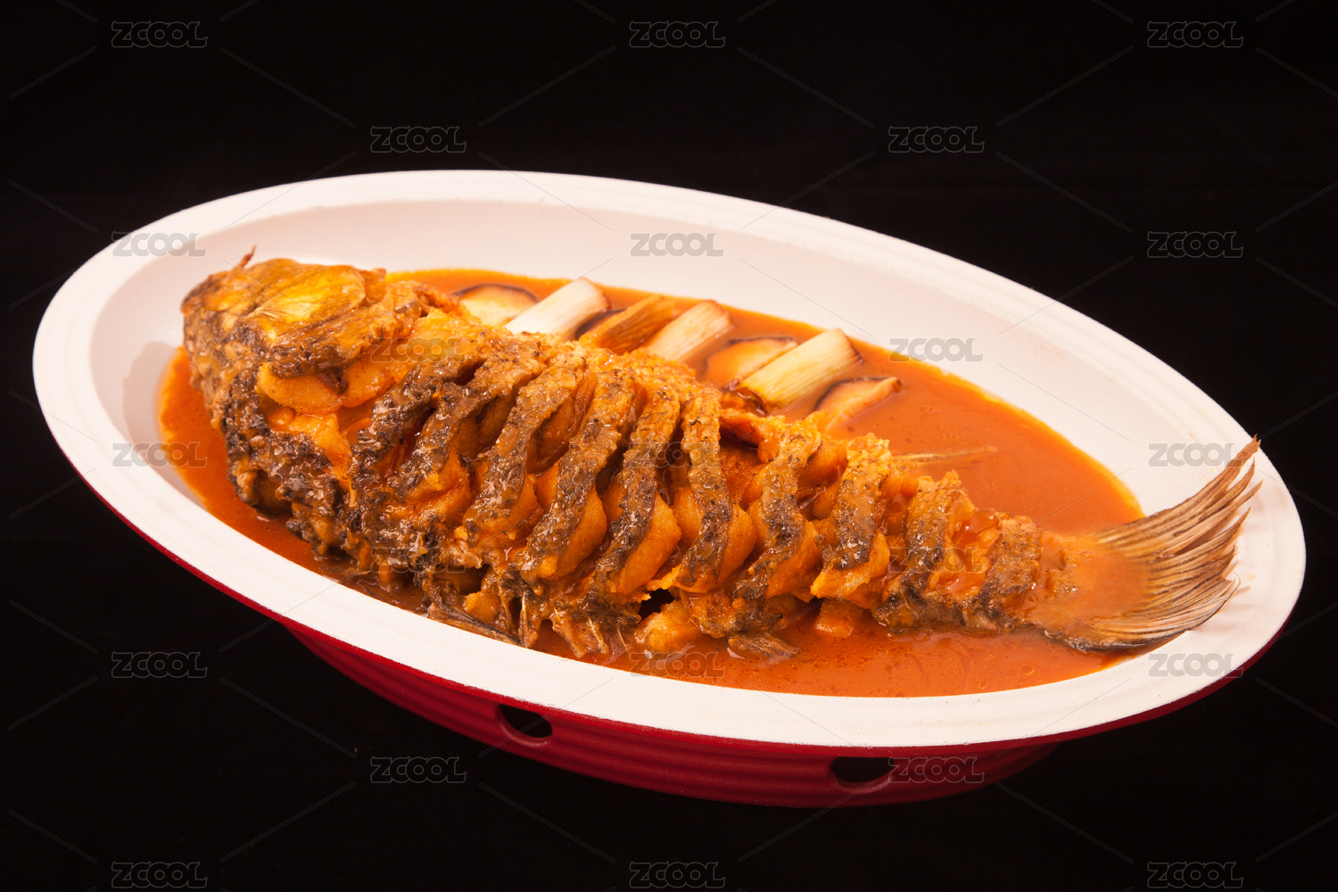中餐黑背景白魚盤黃燜大鯉魚