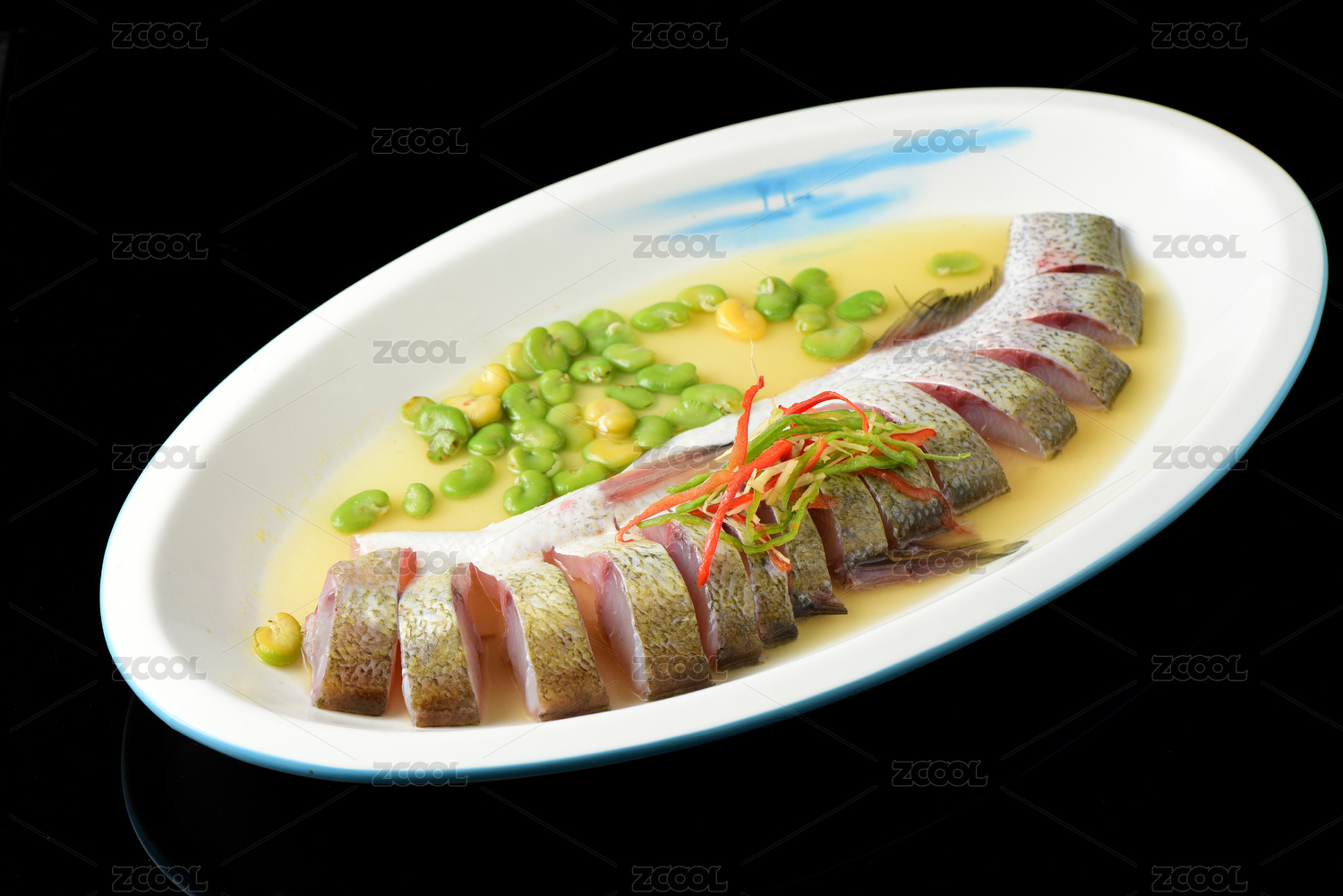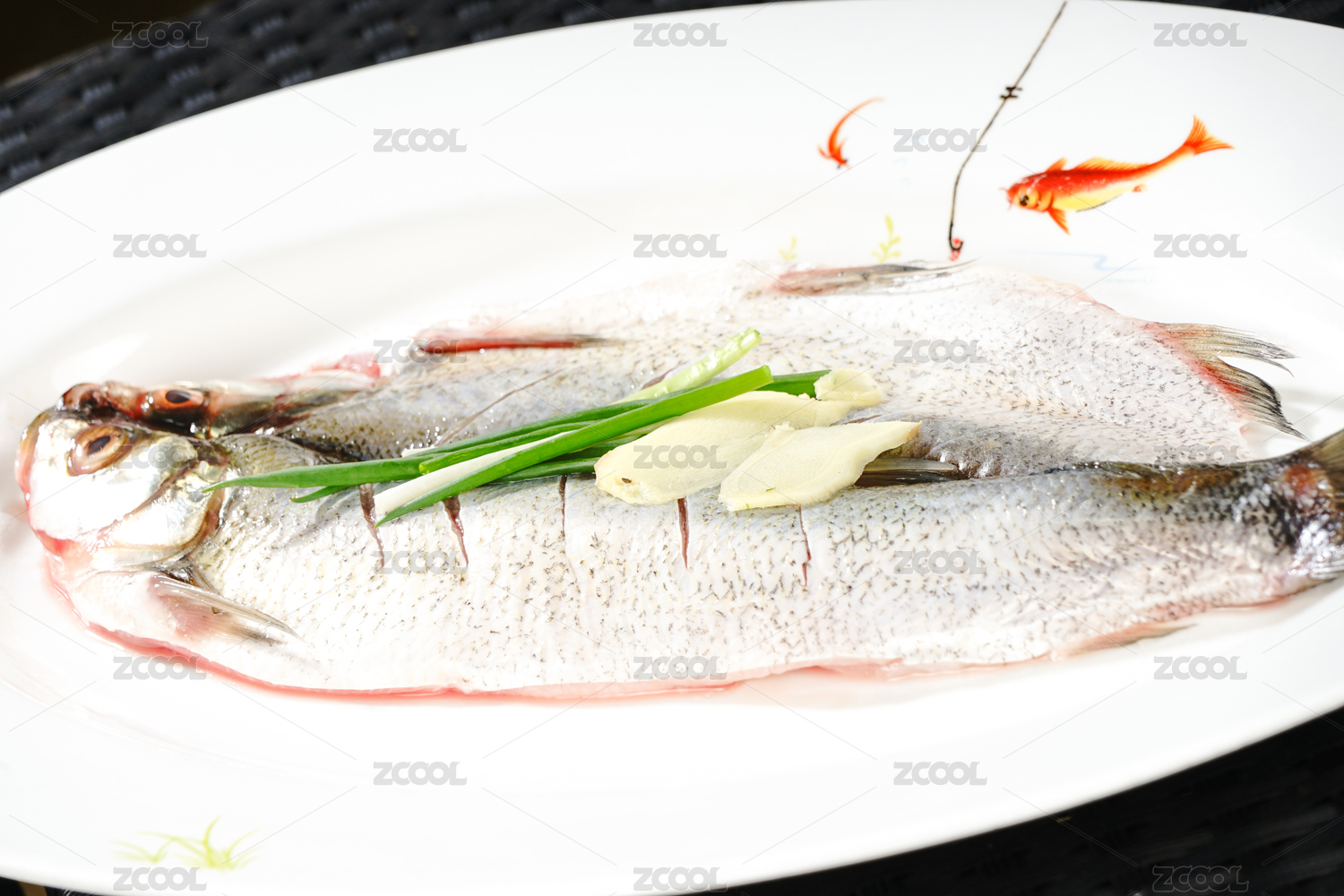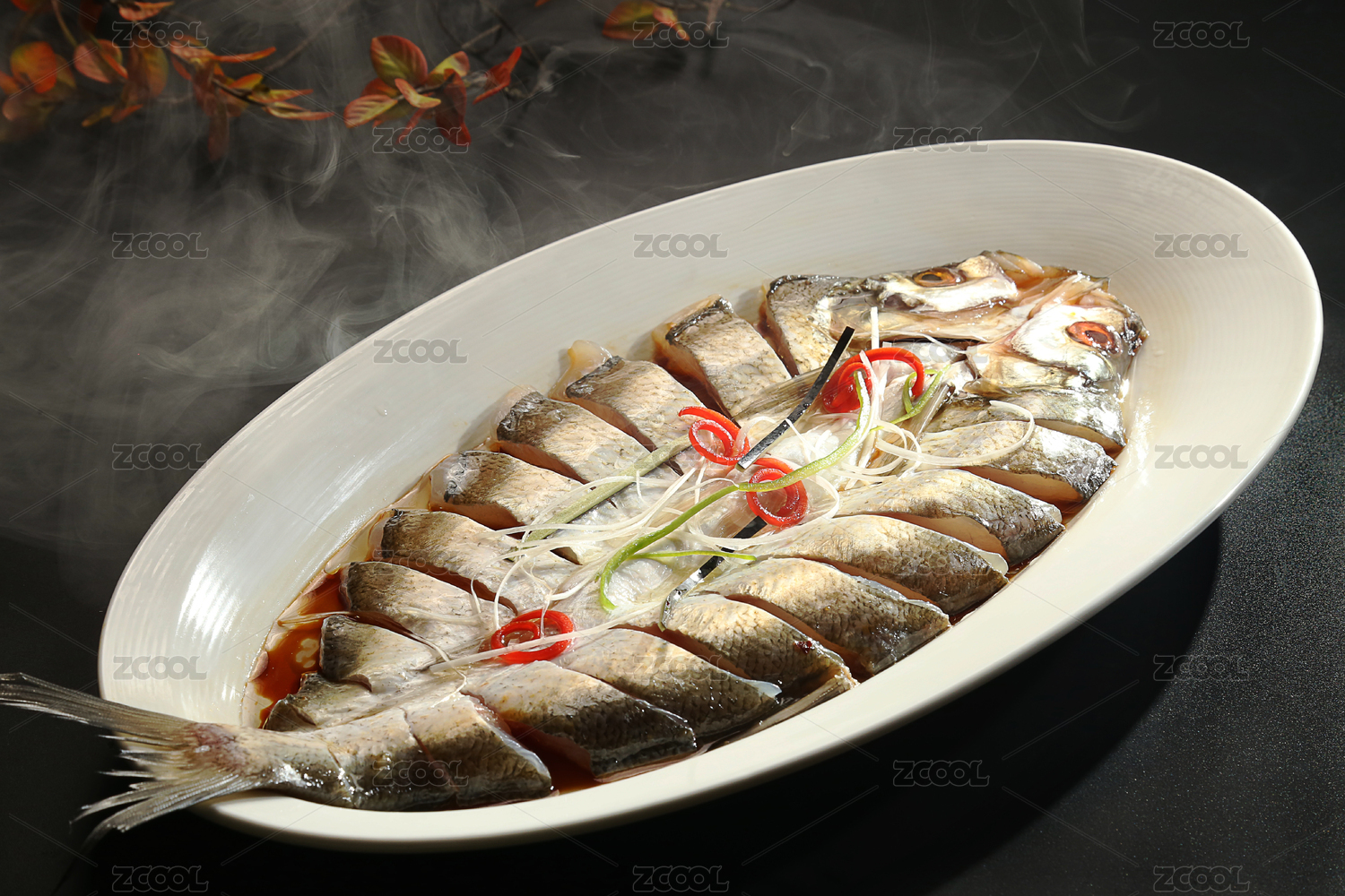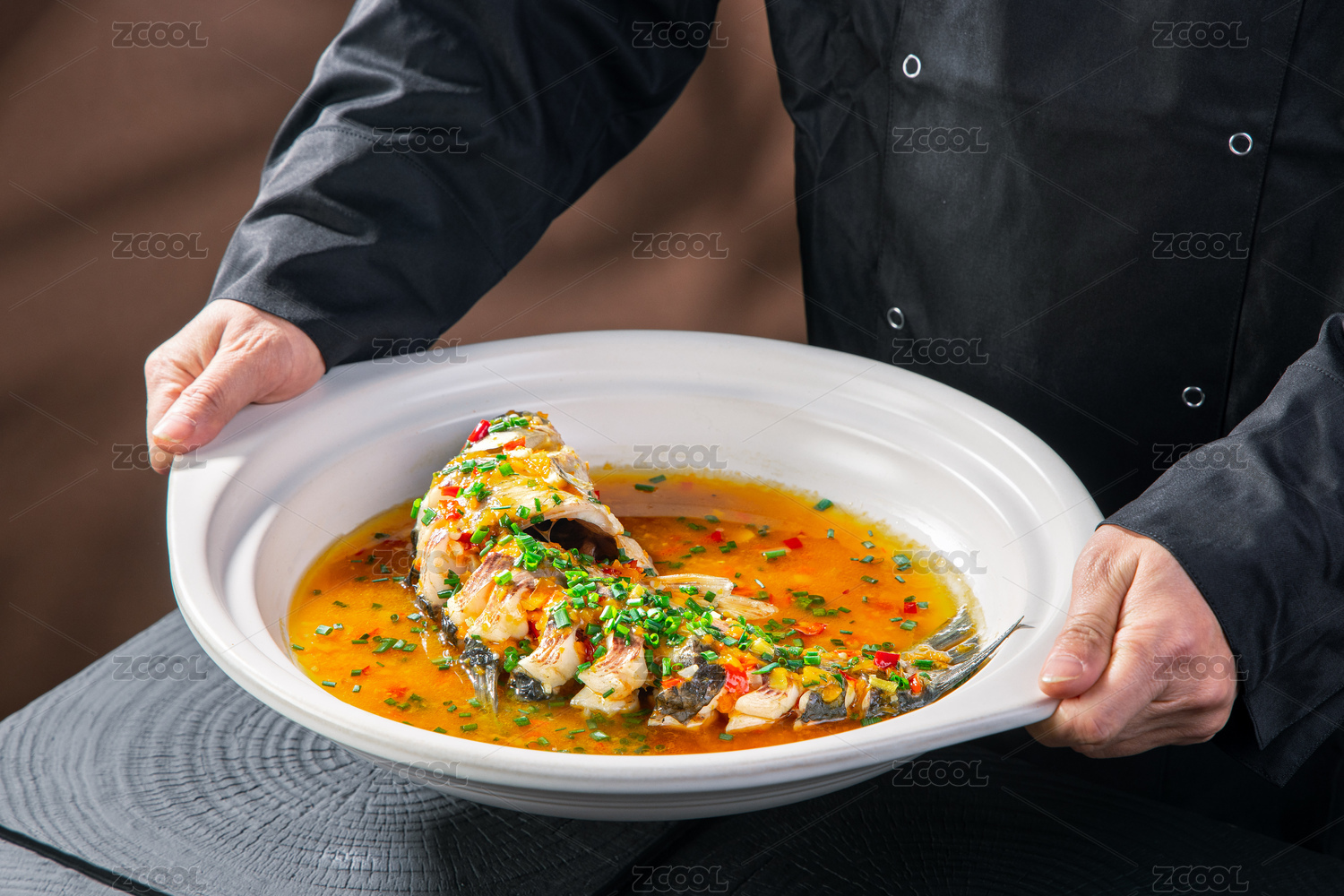 中餐黑背景白魚盤黃燜大鯉魚
