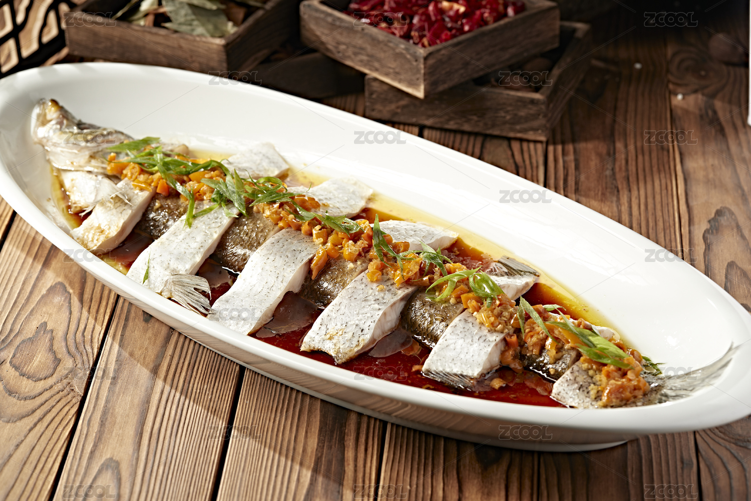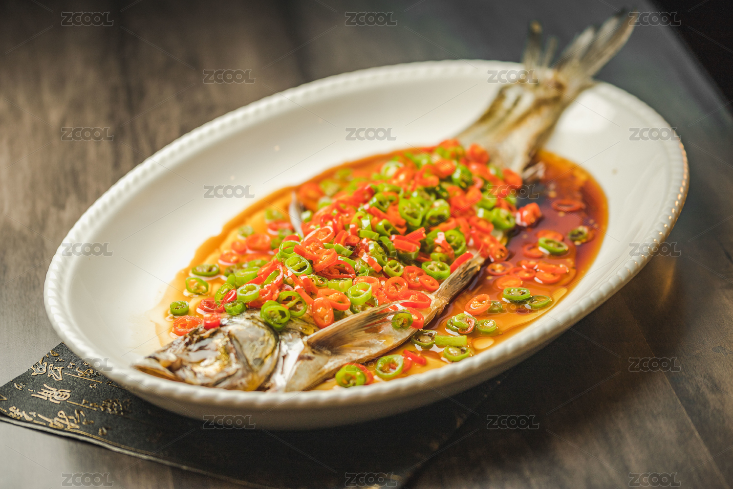 暗色木紋桌面上放著一份清蒸太湖白魚
