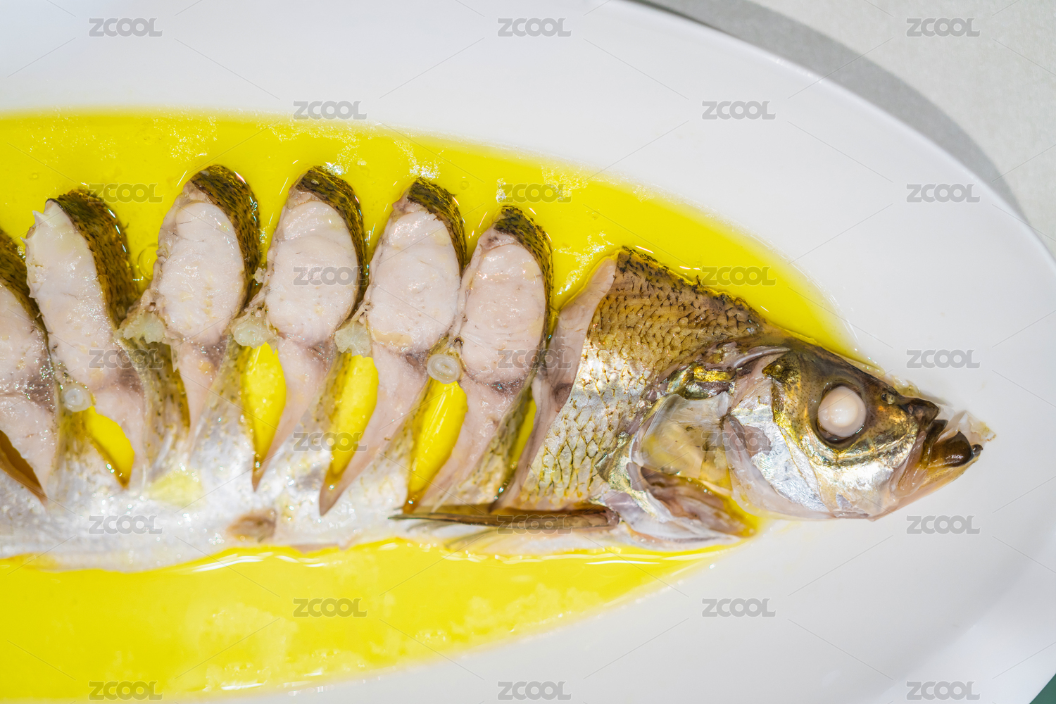 白色橢圓盤里面的清蒸翹嘴白魚