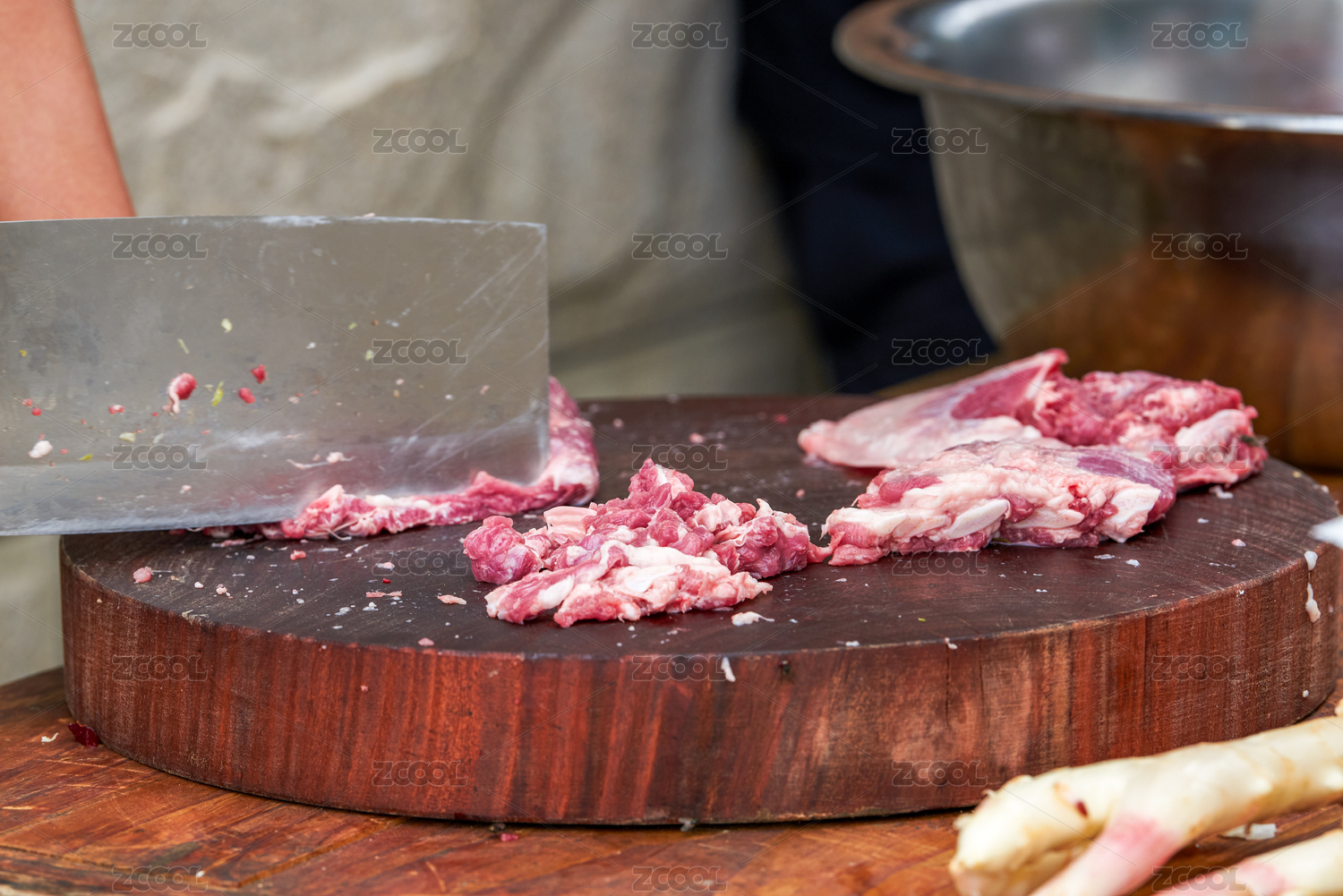 一位廚師在切豬肉,準(zhǔn)備食材