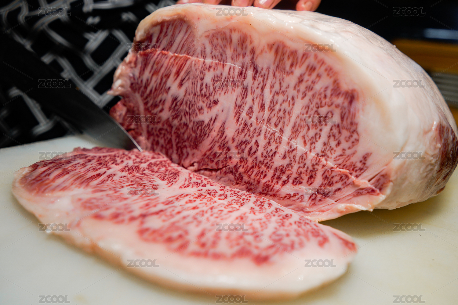 白色菜板上正在用菜刀切片的雪花牛肉