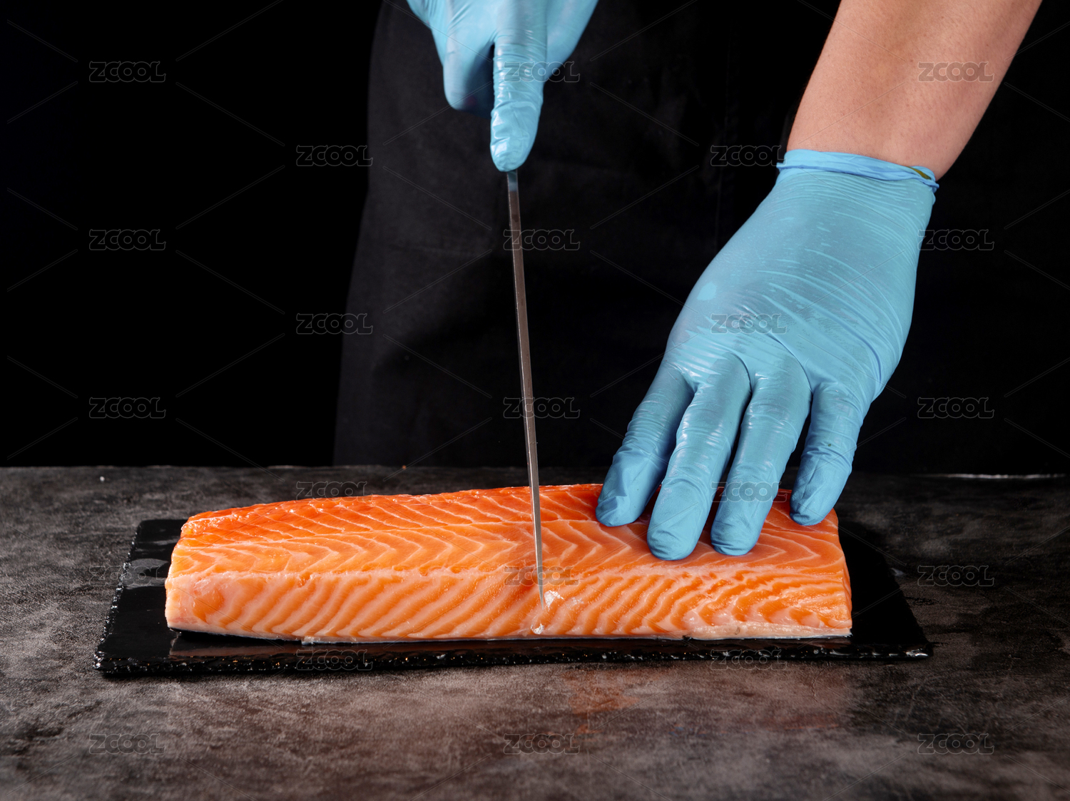 深色背景下手拿刀切塊狀三文魚