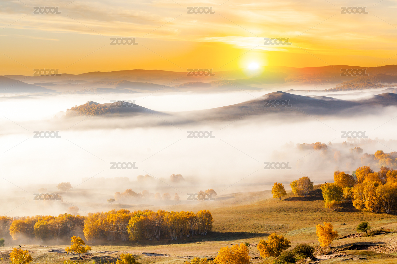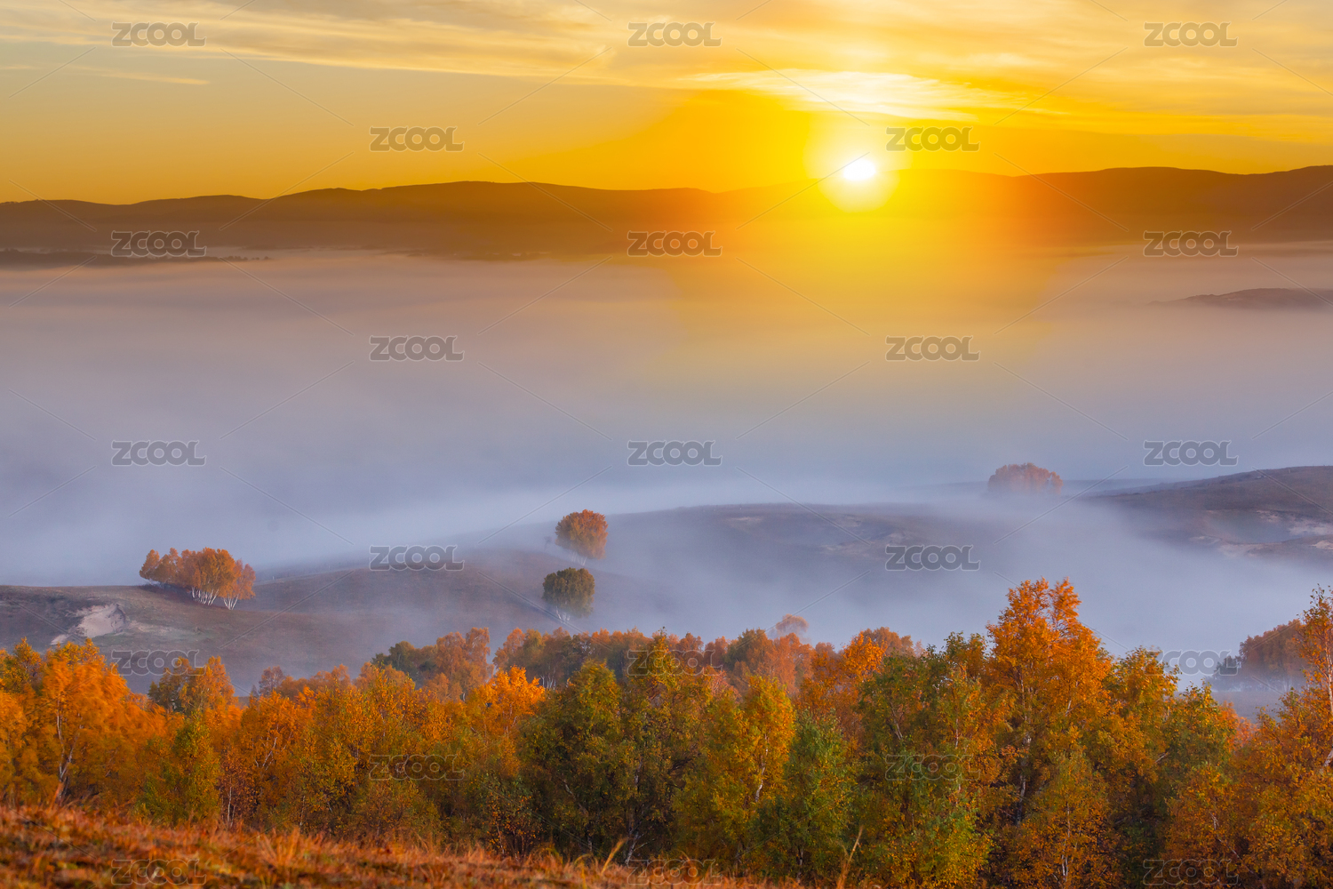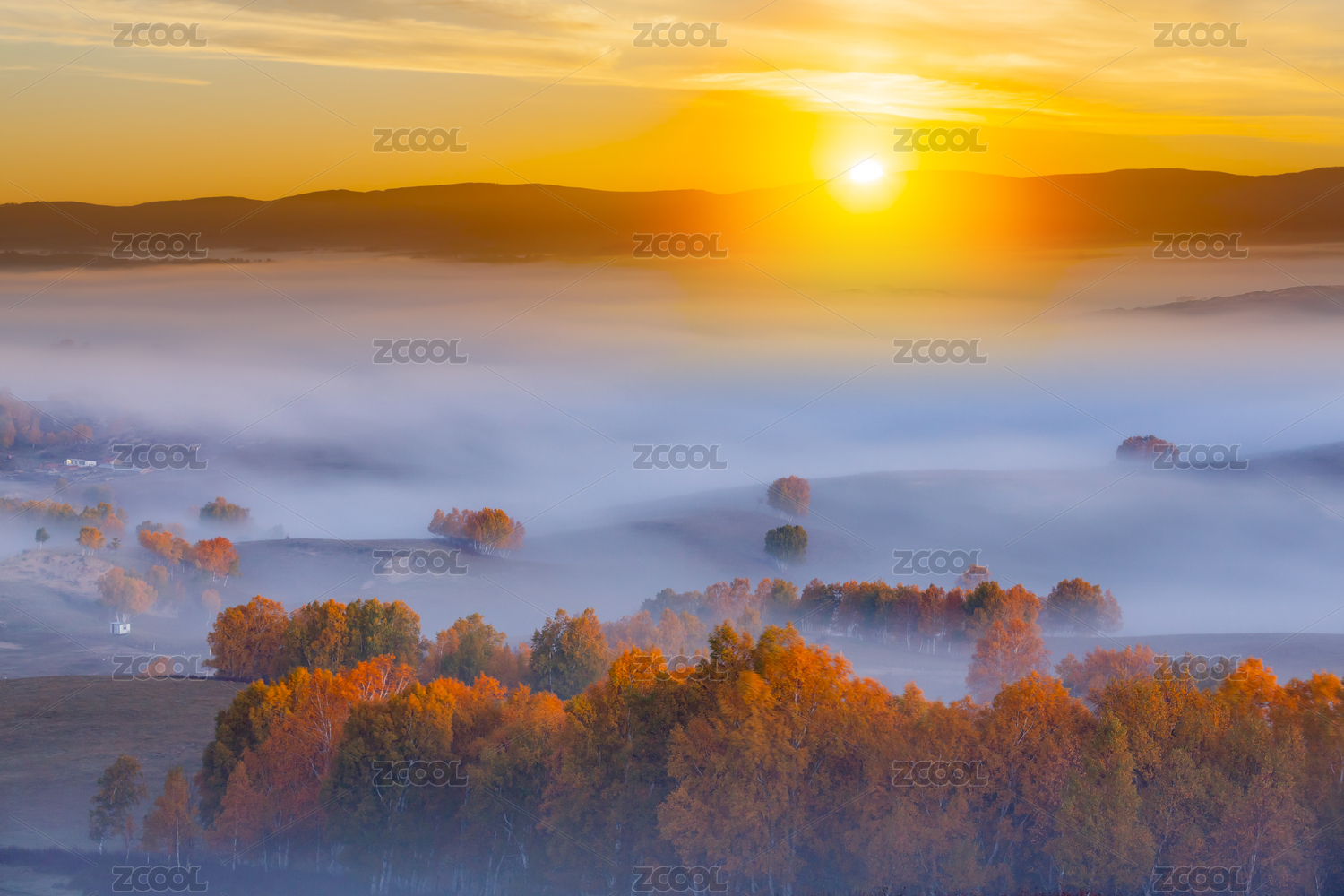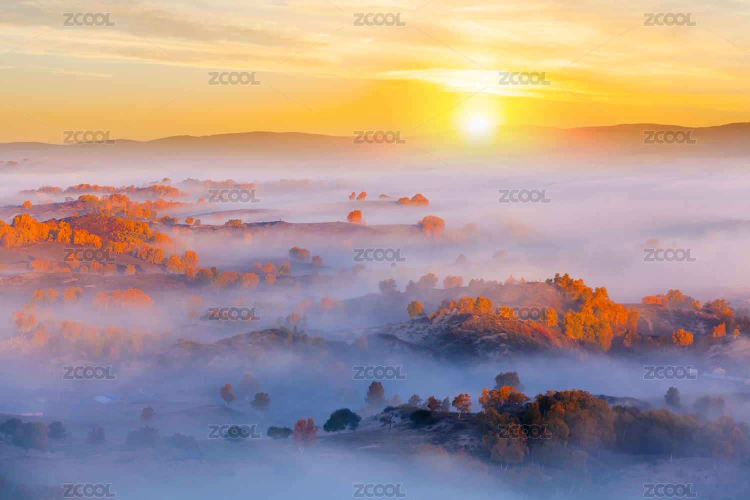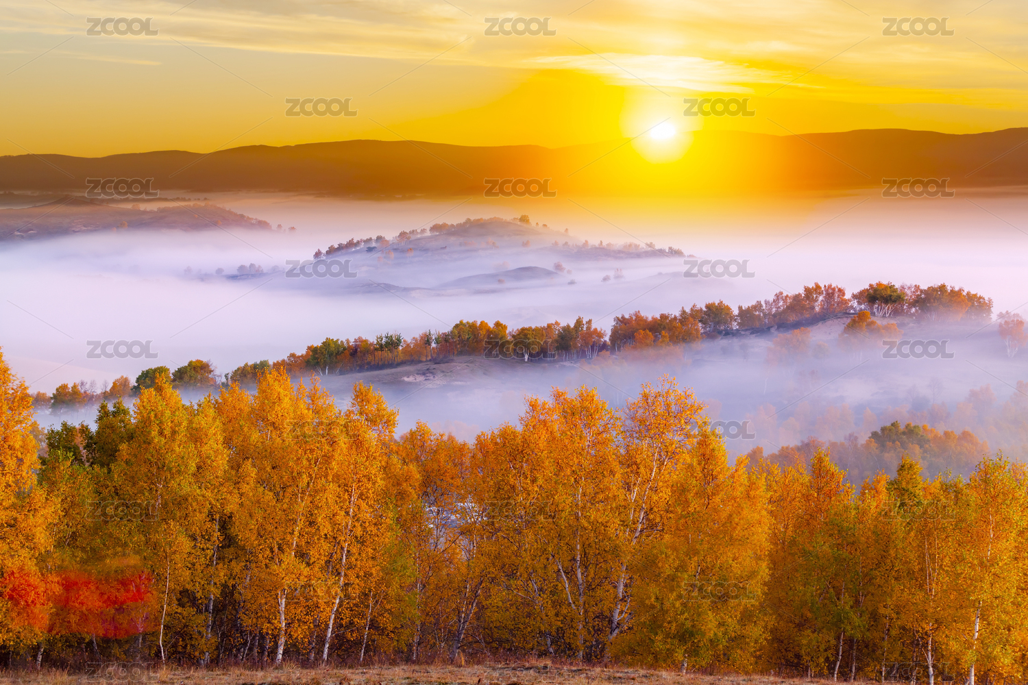 日出太陽升起時(shí)云霧中的秋色