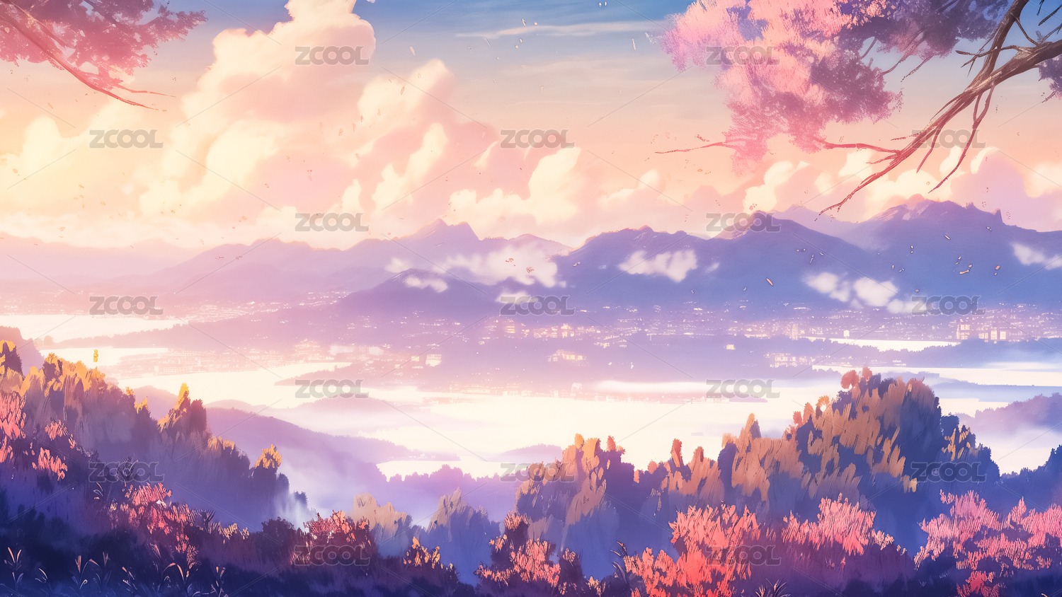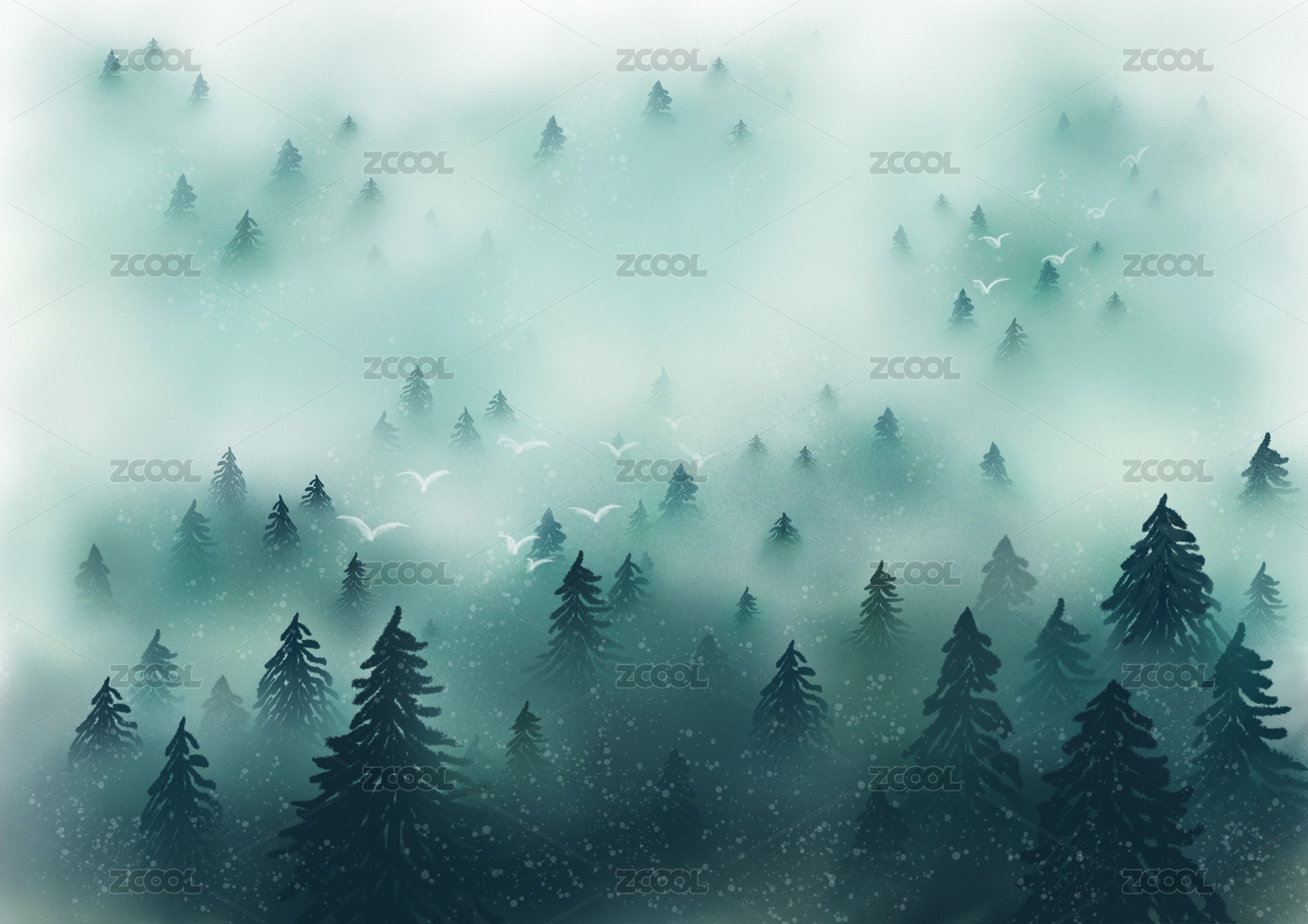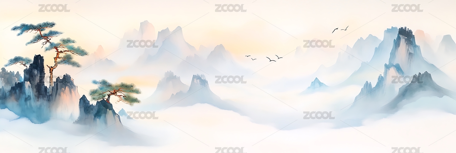 手繪云霧松樹山林飛鳥