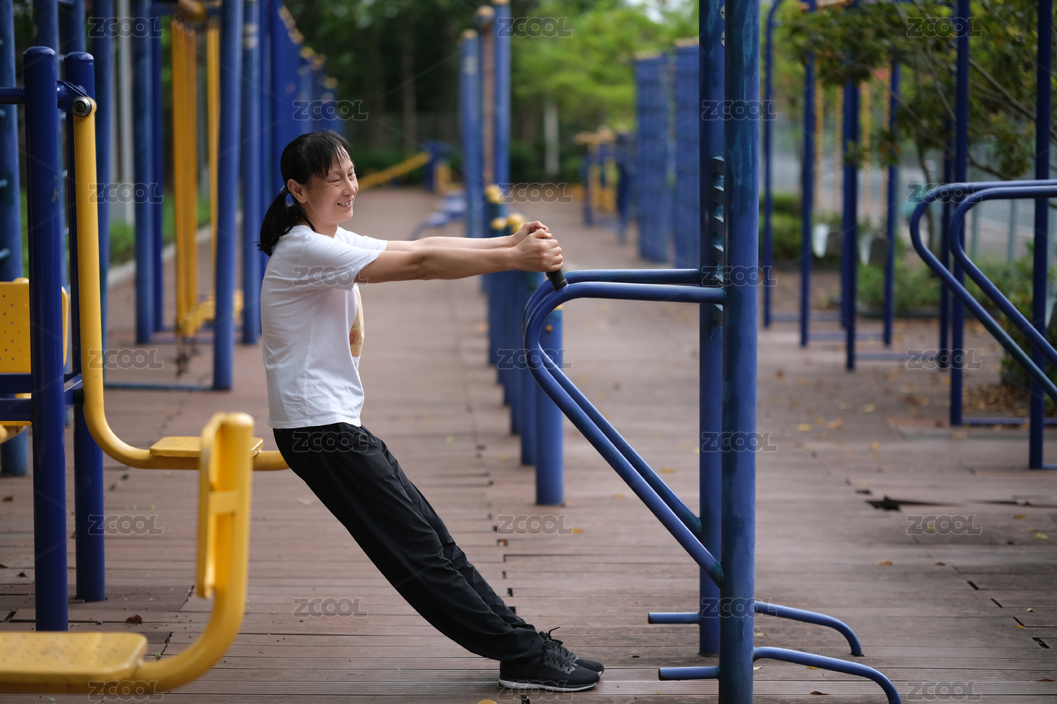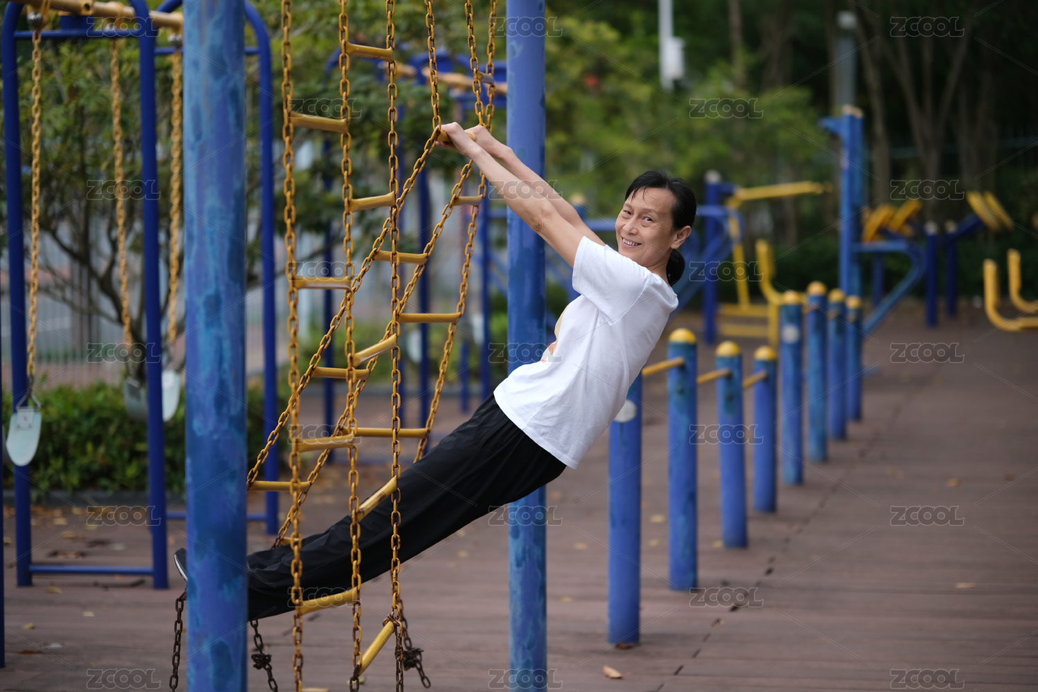開(kāi)心的中國(guó)中老年女性在戶外健身器材上健身