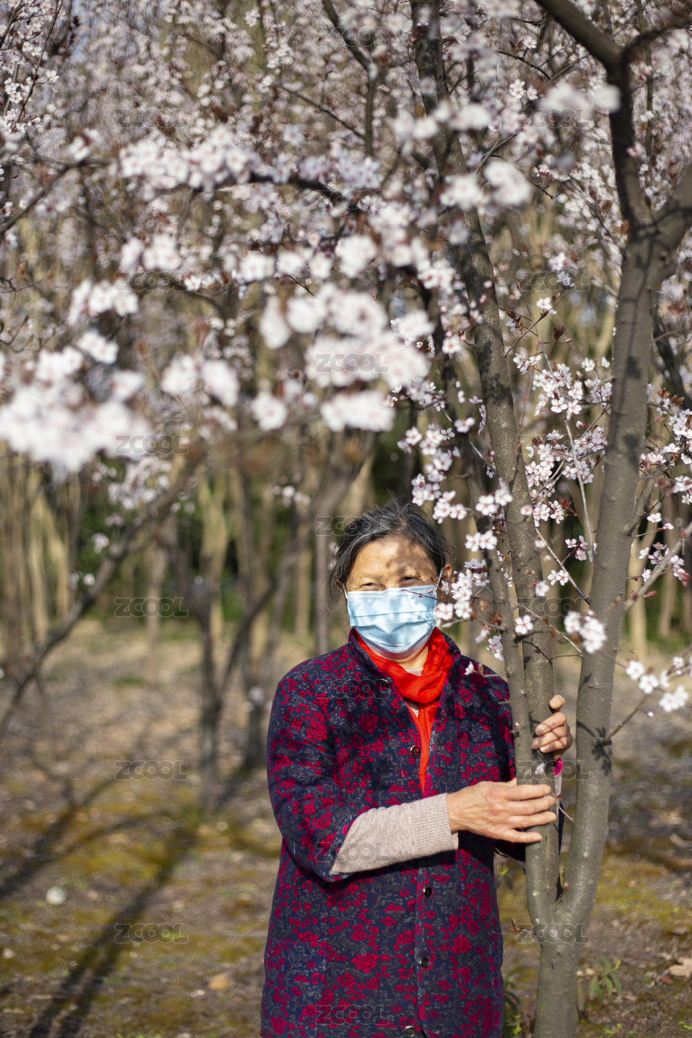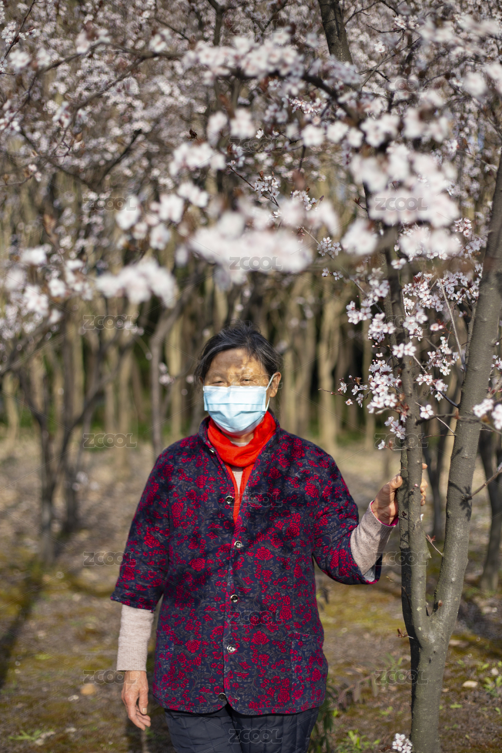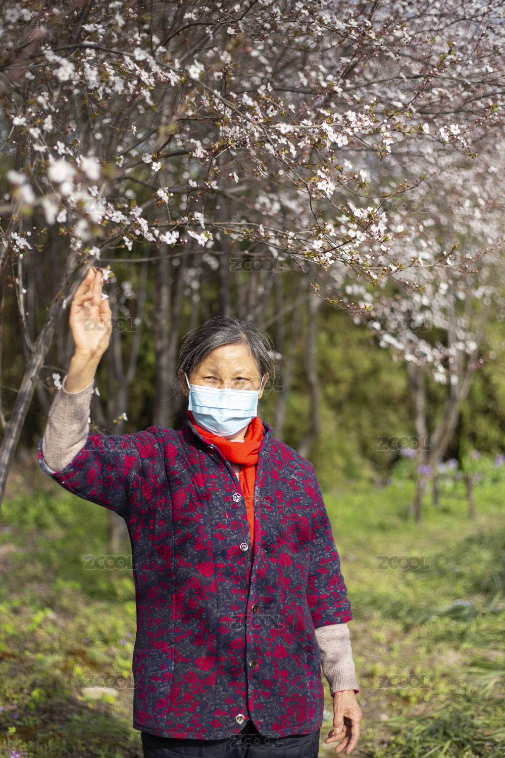 老年女性戴口罩賞花