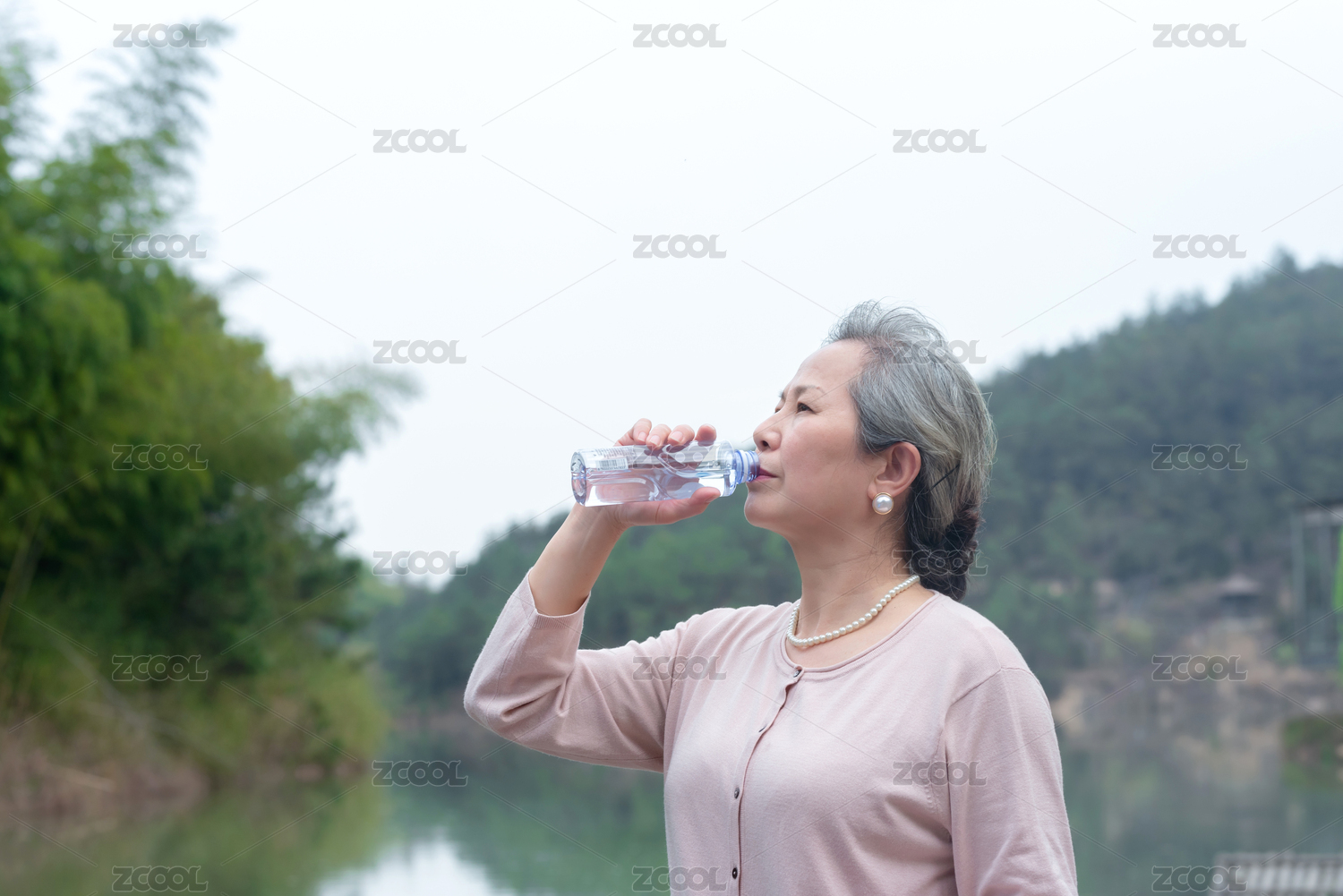一個(gè)在喝水的亞洲老年女性