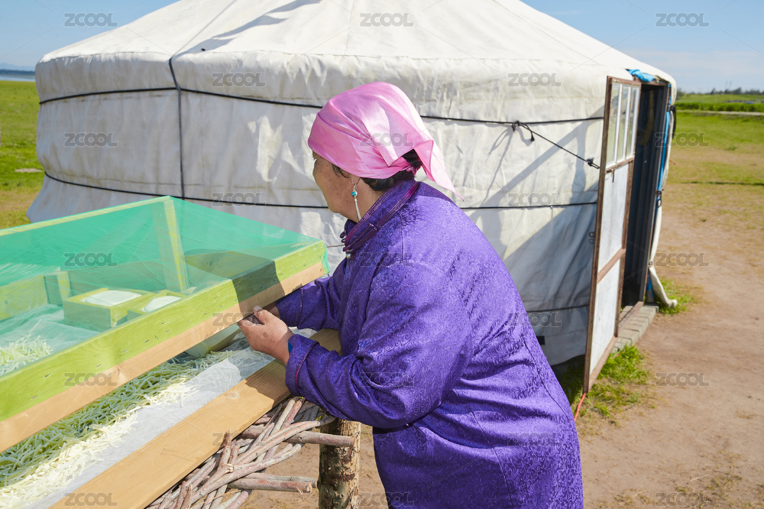 在蒙古包外晾曬奶制品的蒙古族中老年女性