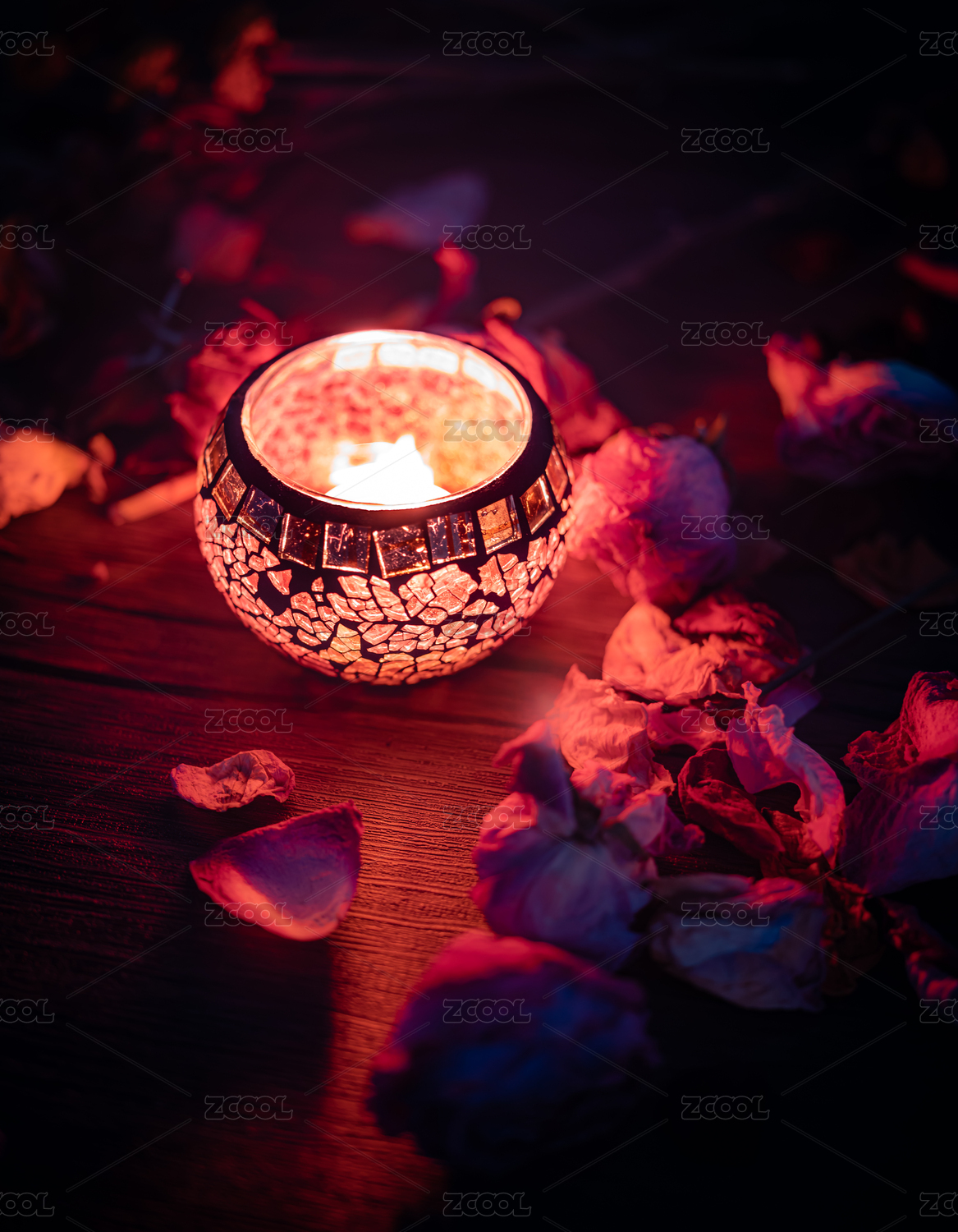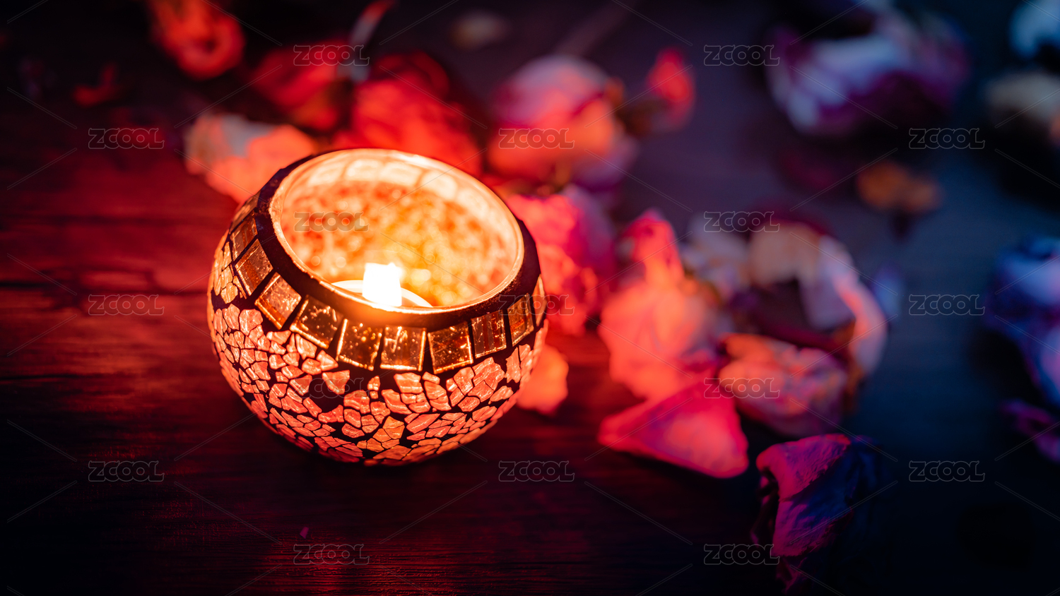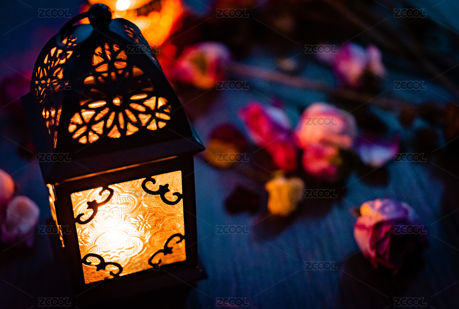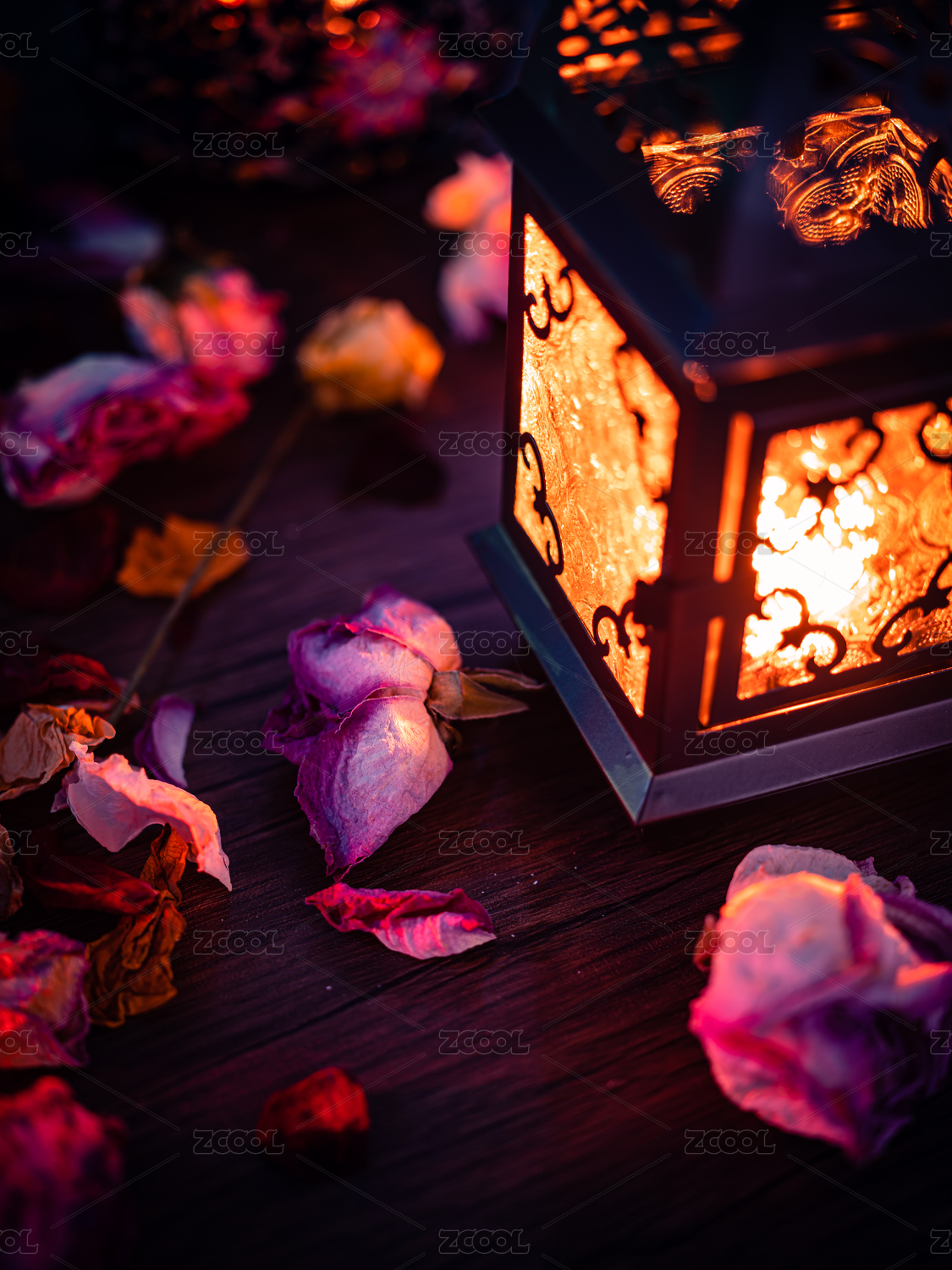 桌子上的復(fù)古燭臺(tái)燭籠與花瓣