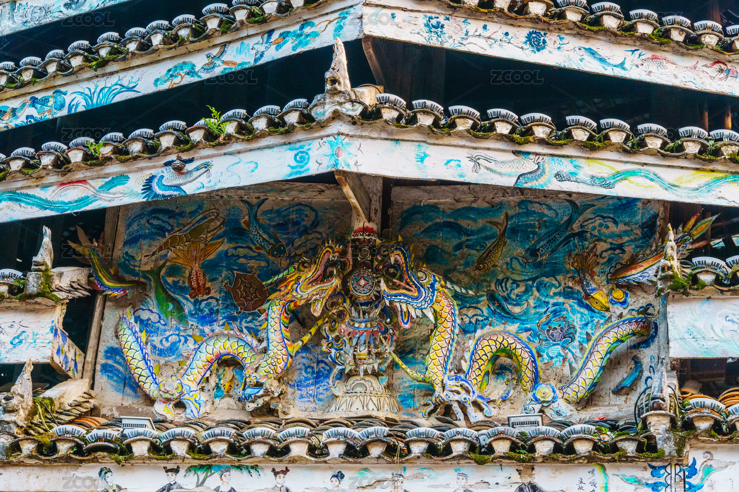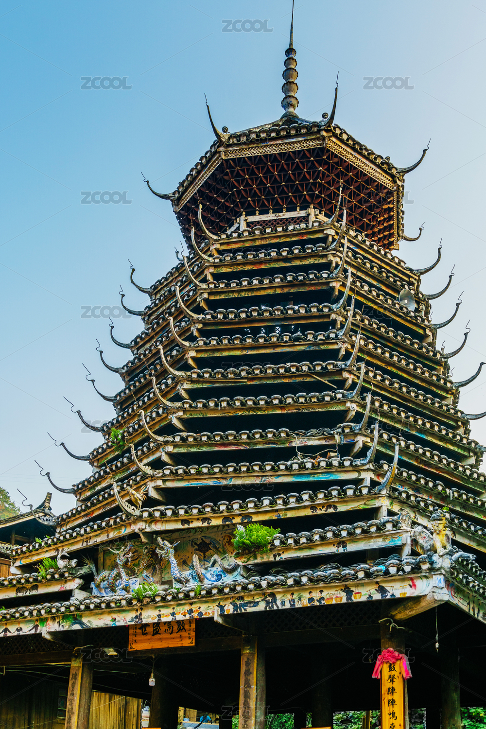 中國(guó)貴州黔東南肇興侗寨秋季鼓樓頂部繪畫和雕