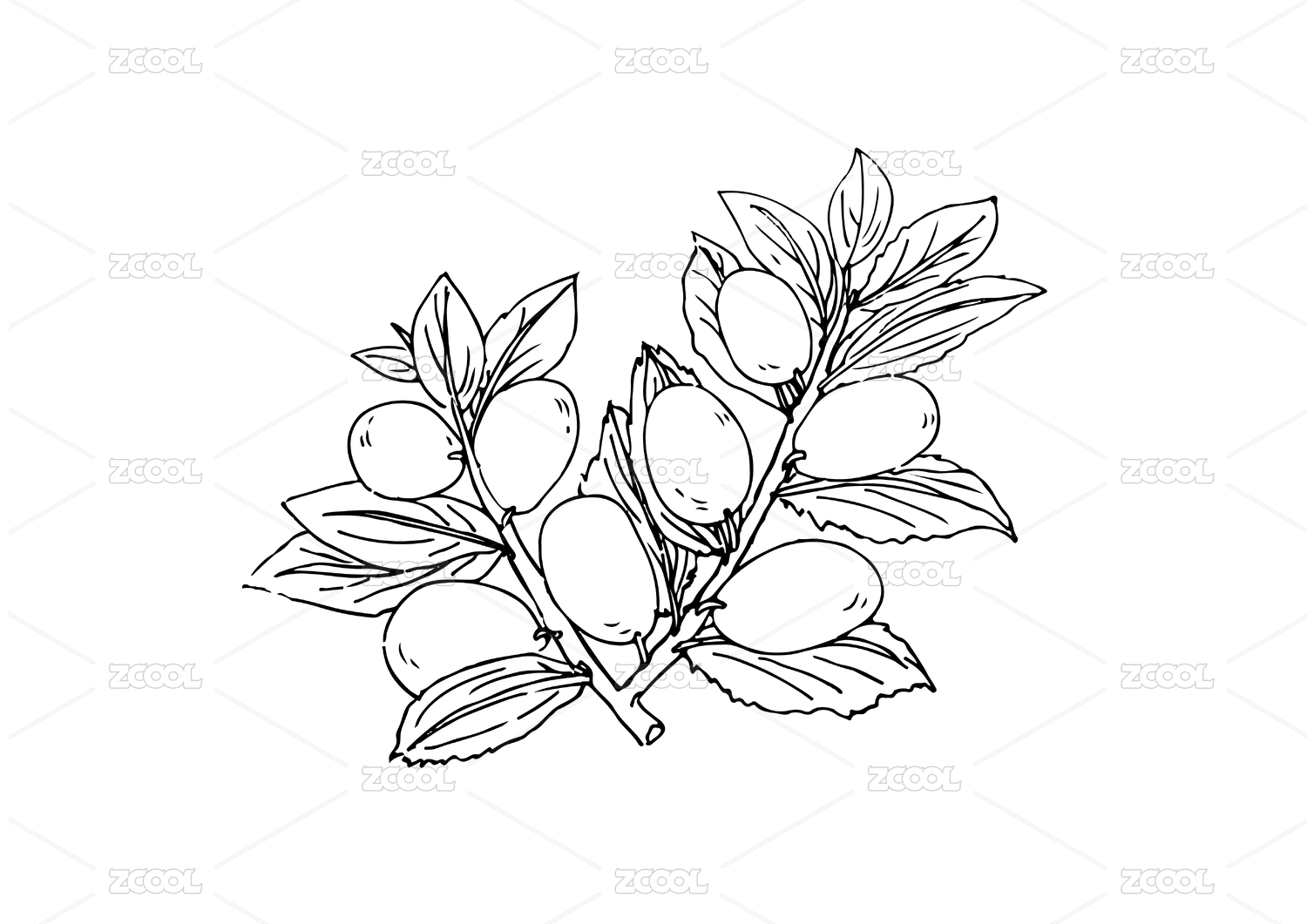 一枝酸棗仁簡筆畫的中藥植物黑白特寫