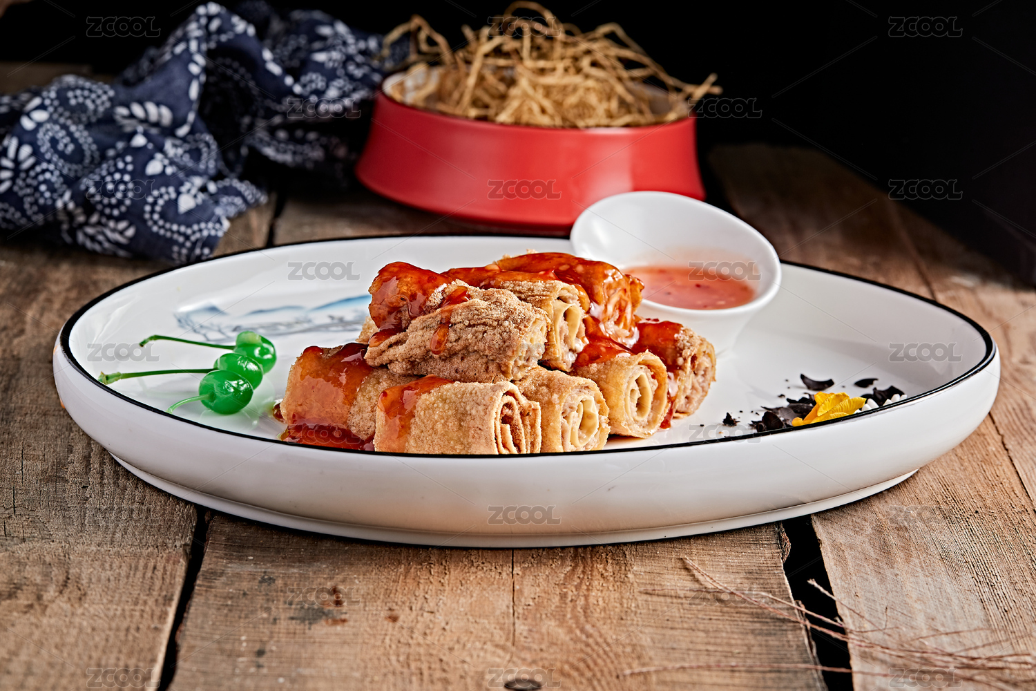 白色背景盤中熏干豆腐卷