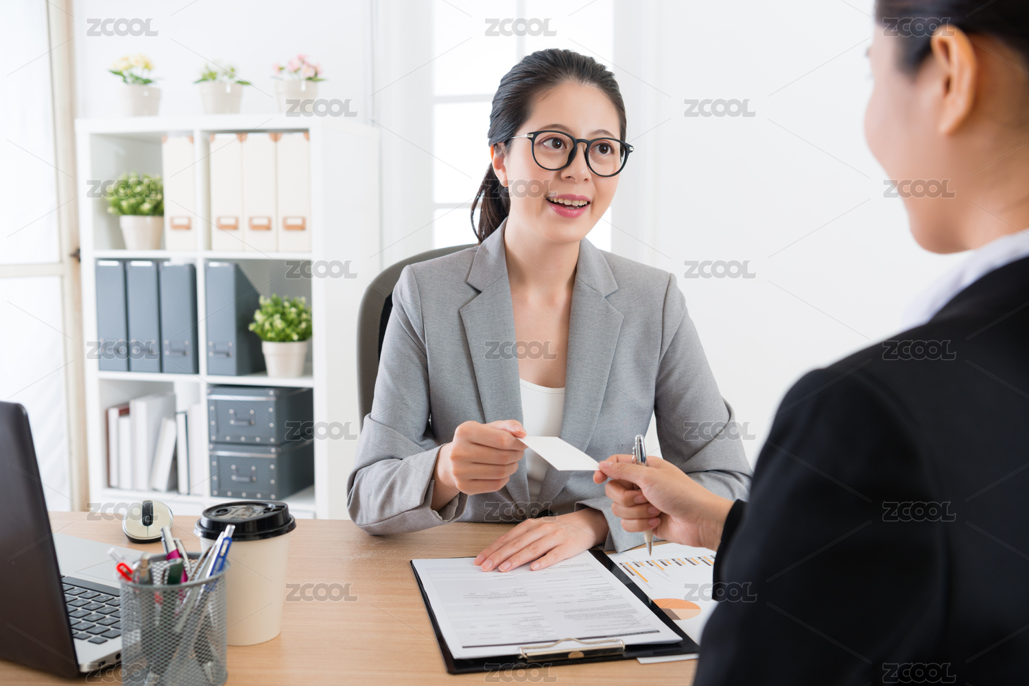 年輕的亞洲辦公室女郎自我介紹,然后給她的經(jīng)營(yíng)業(yè)務(wù)卡的老板。