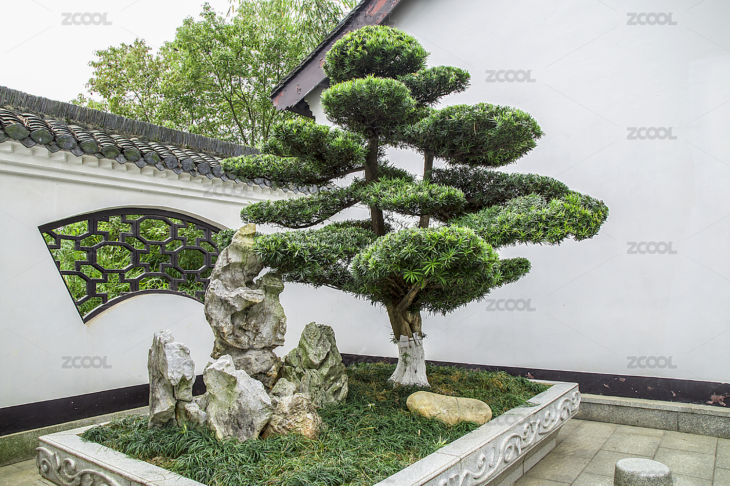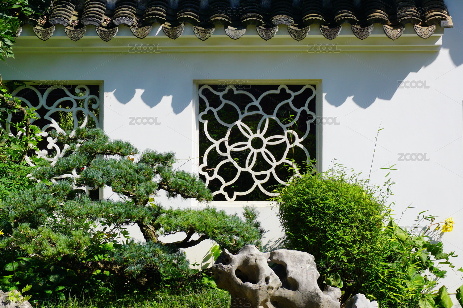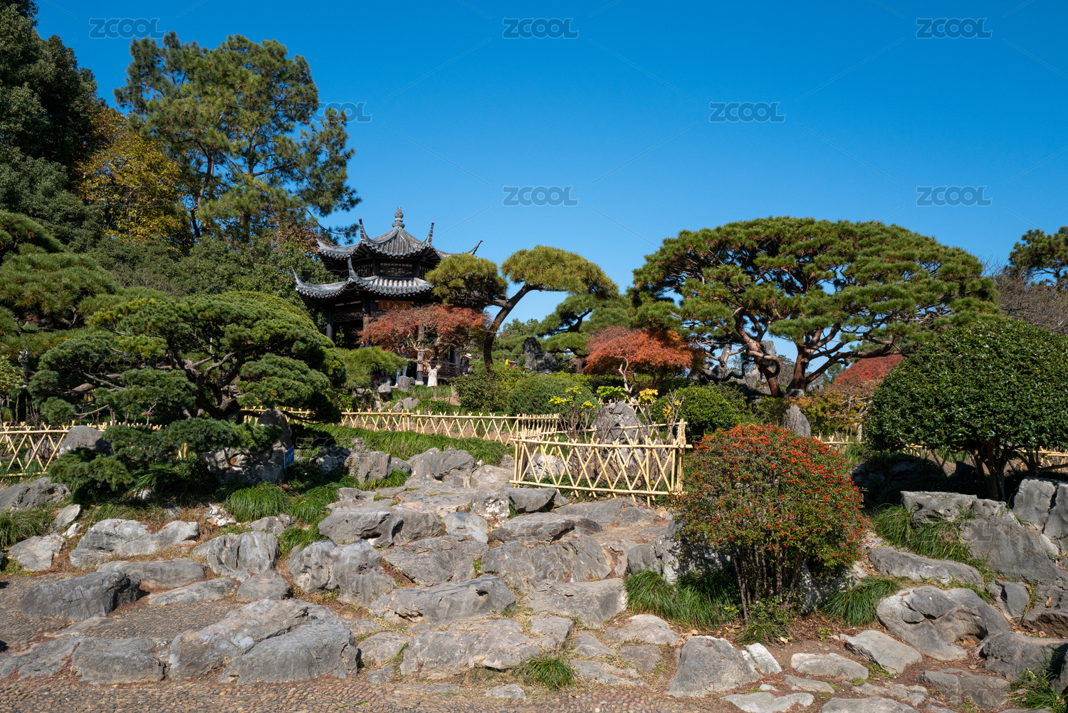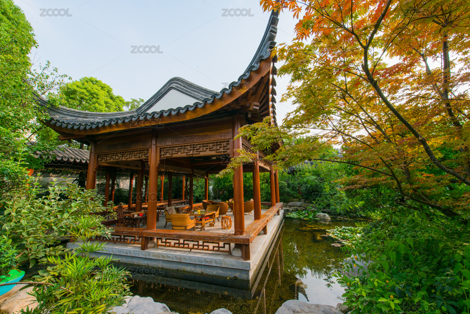中式園林中的亭臺綠植景致