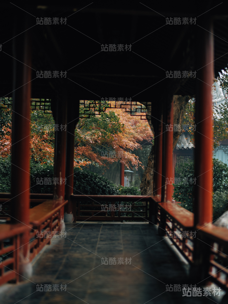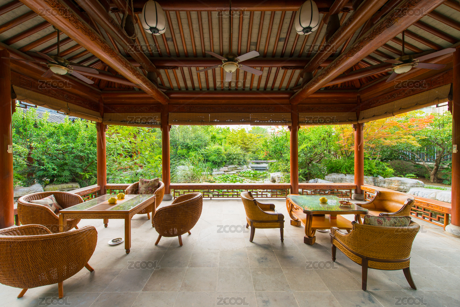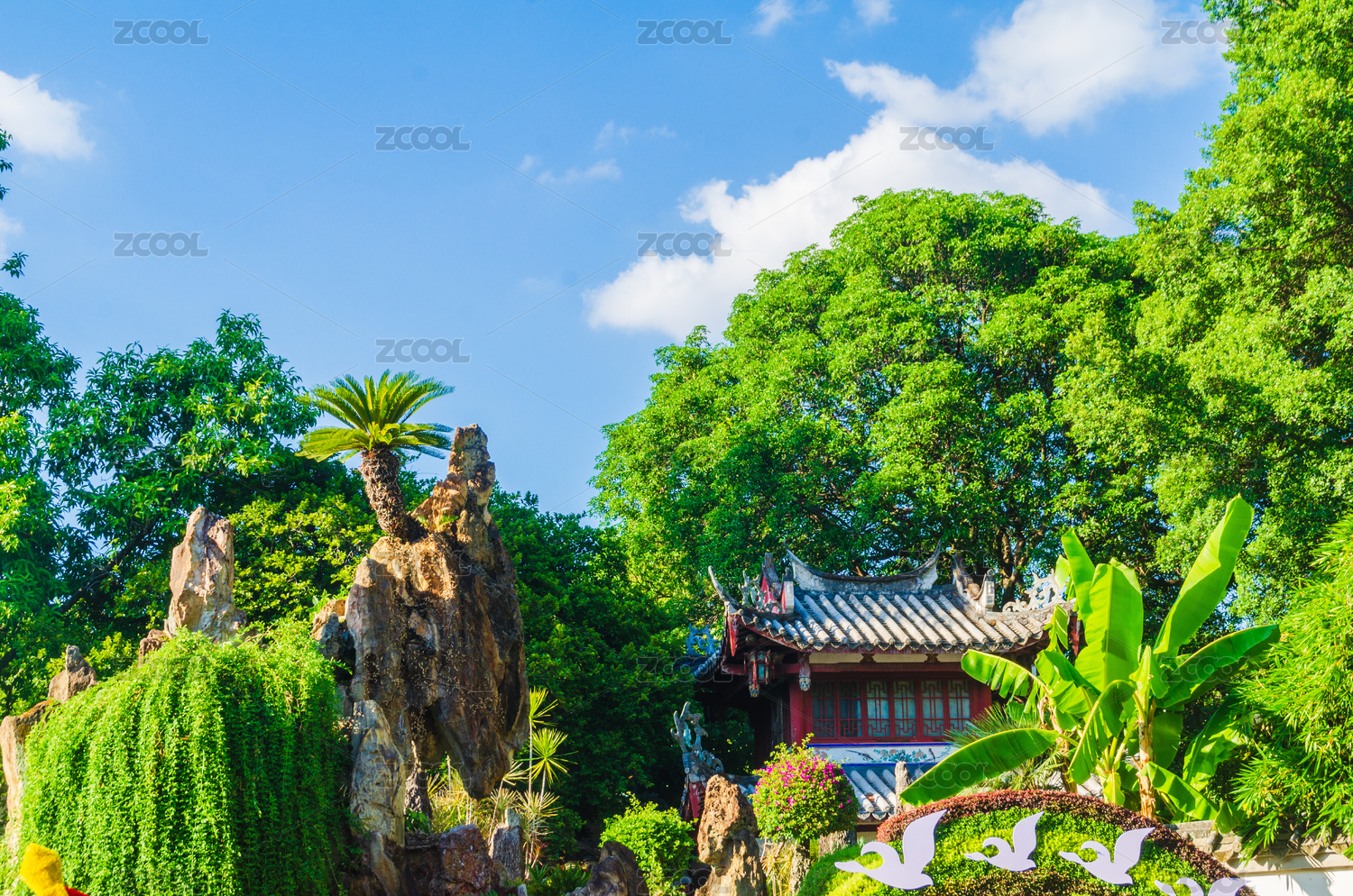 中式園林中的亭臺綠植景致