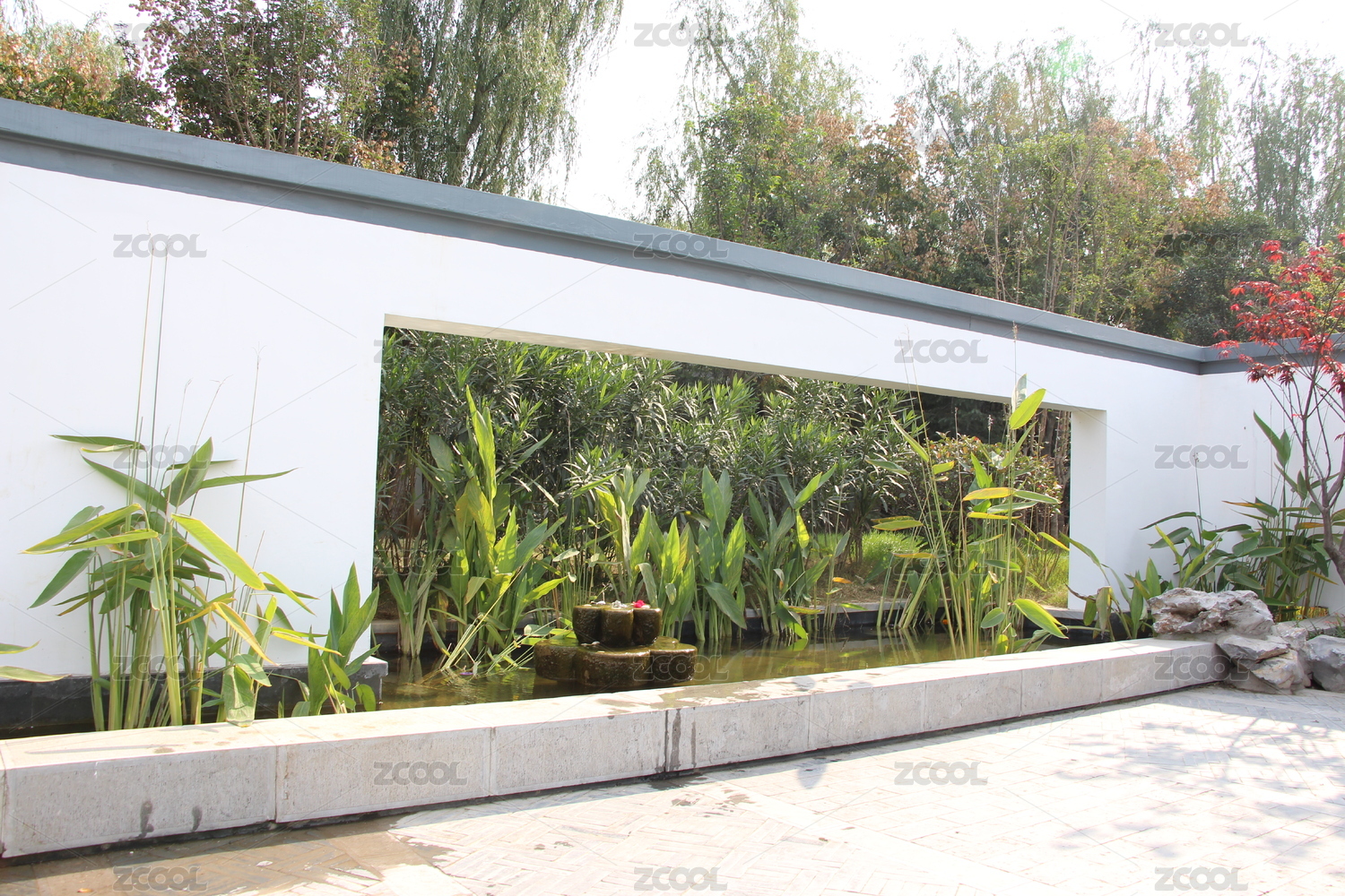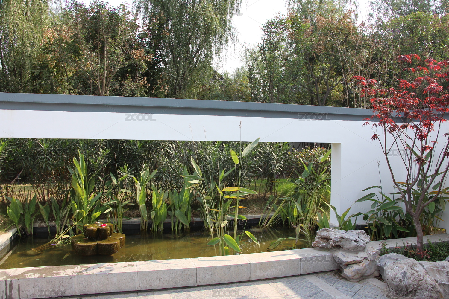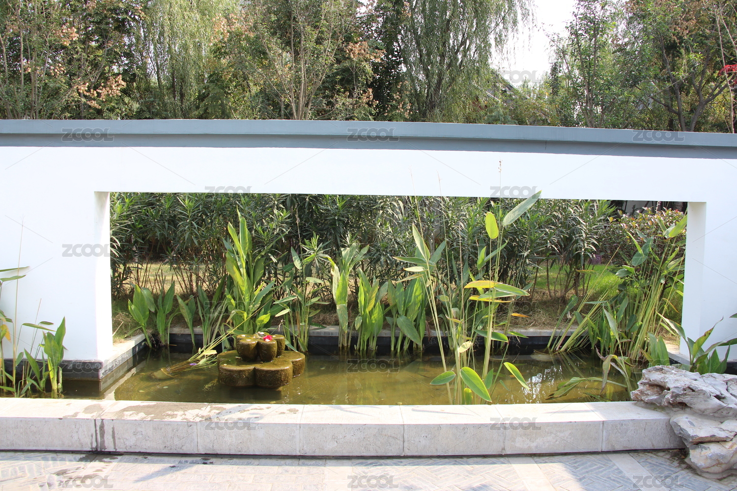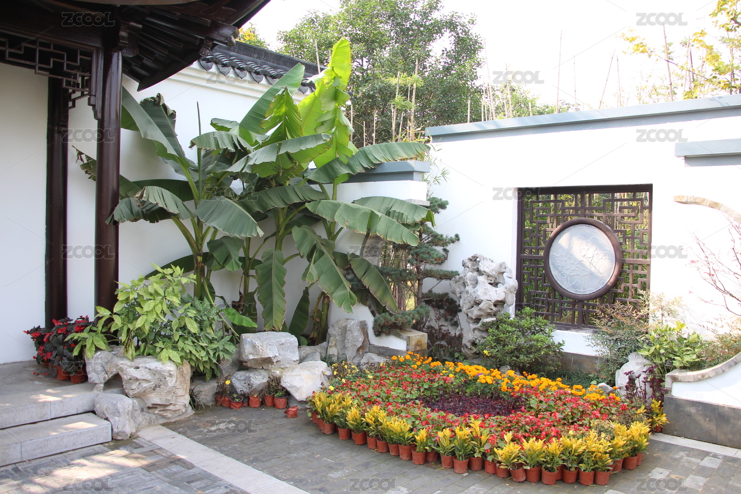 中式園林中的亭臺綠植景致