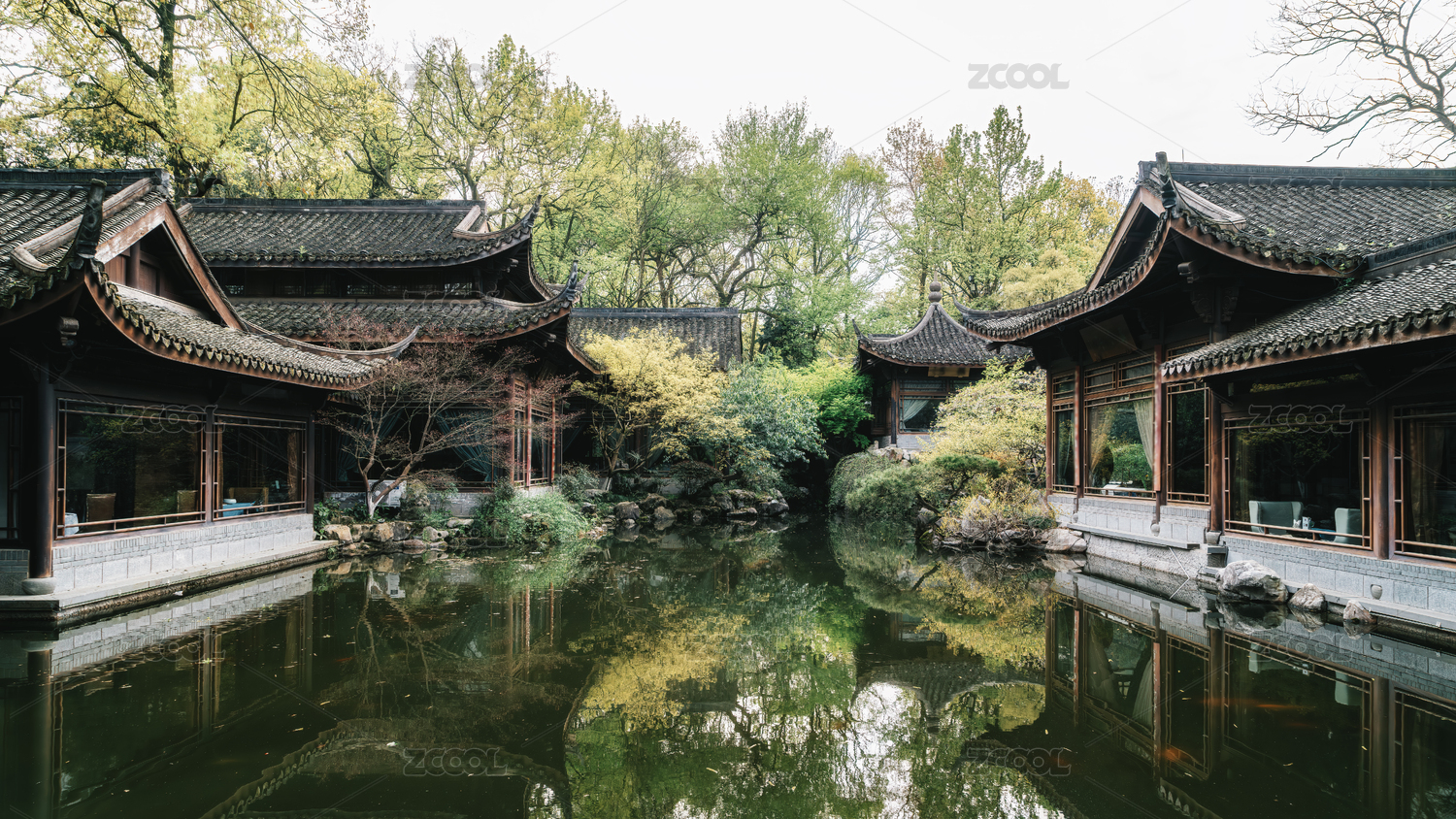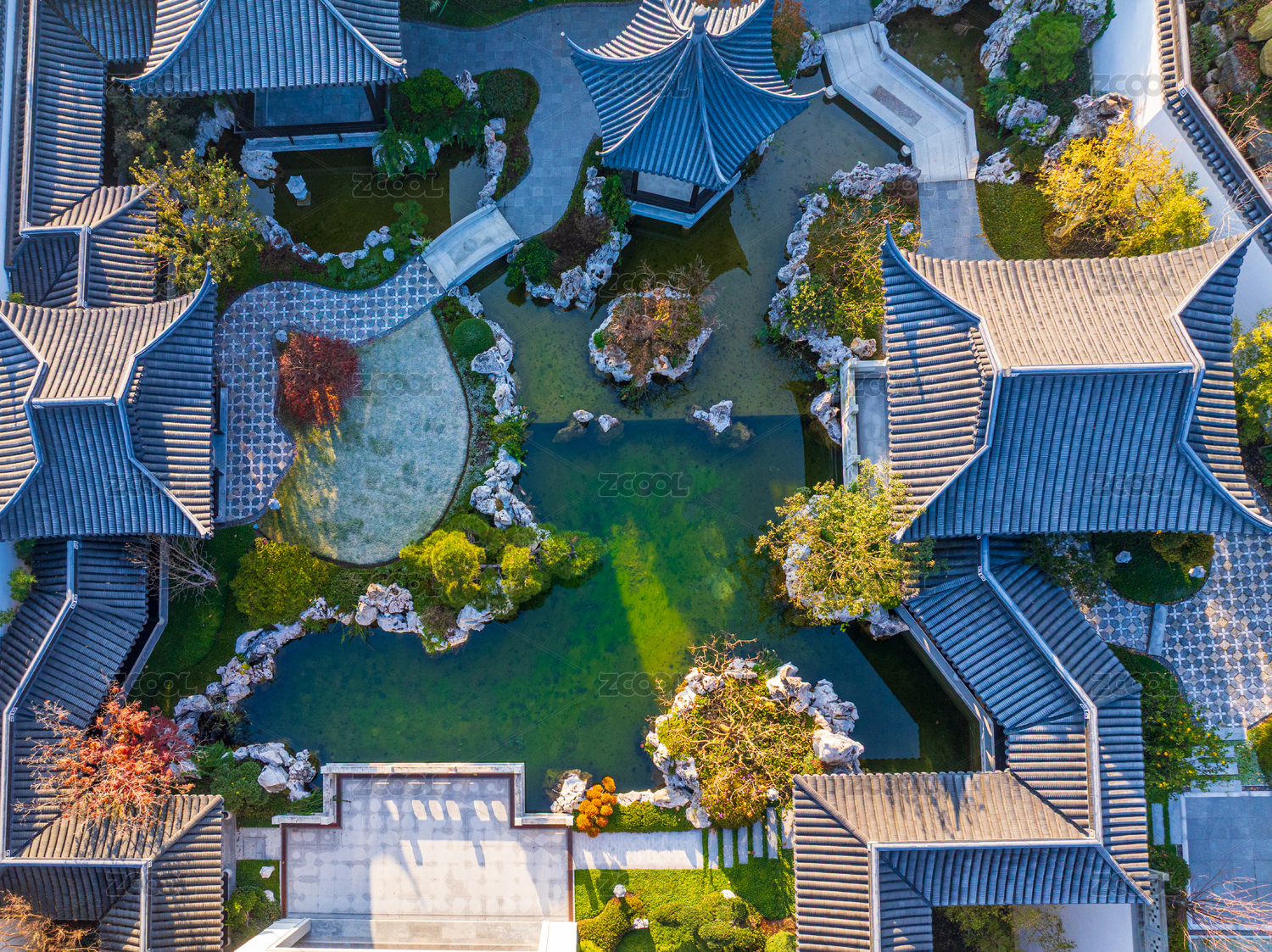 傳統(tǒng)建筑環(huán)繞的中式園林俯瞰圖