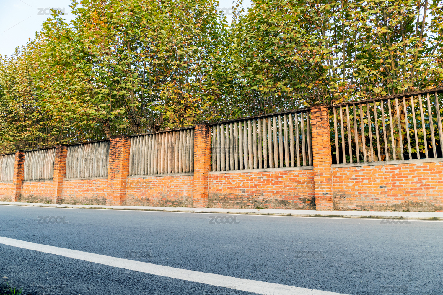 紅磚圍墻邊上的瀝青道路路面