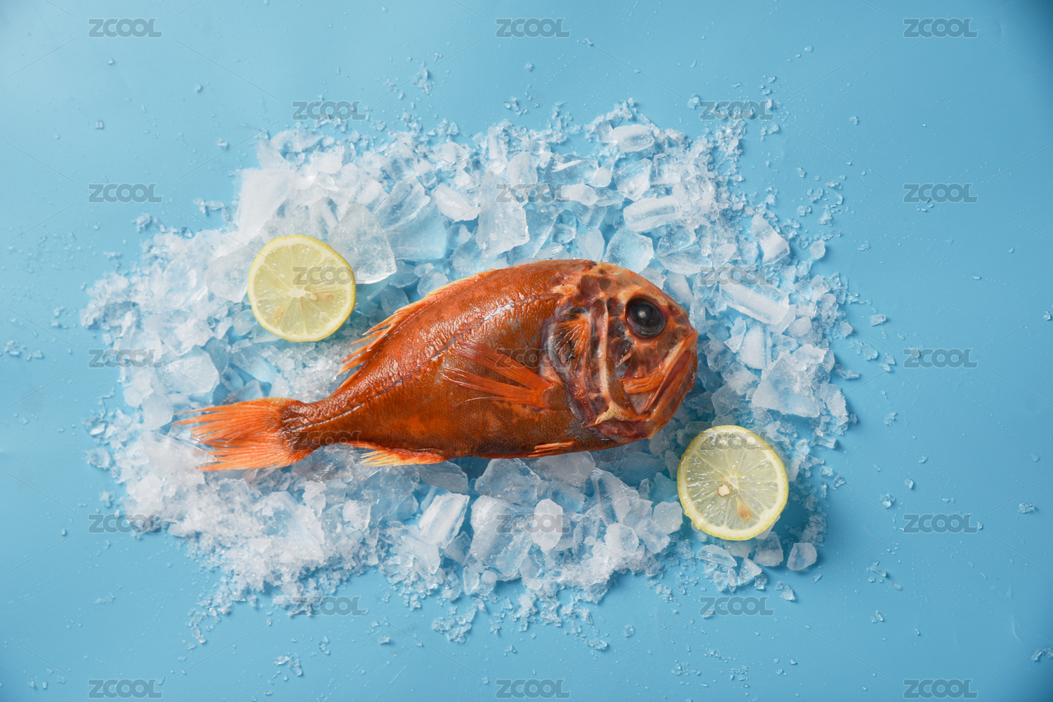 正上方藍(lán)色背景下的海鮮長(zhǎng)壽魚(yú)和檸檬冰塊