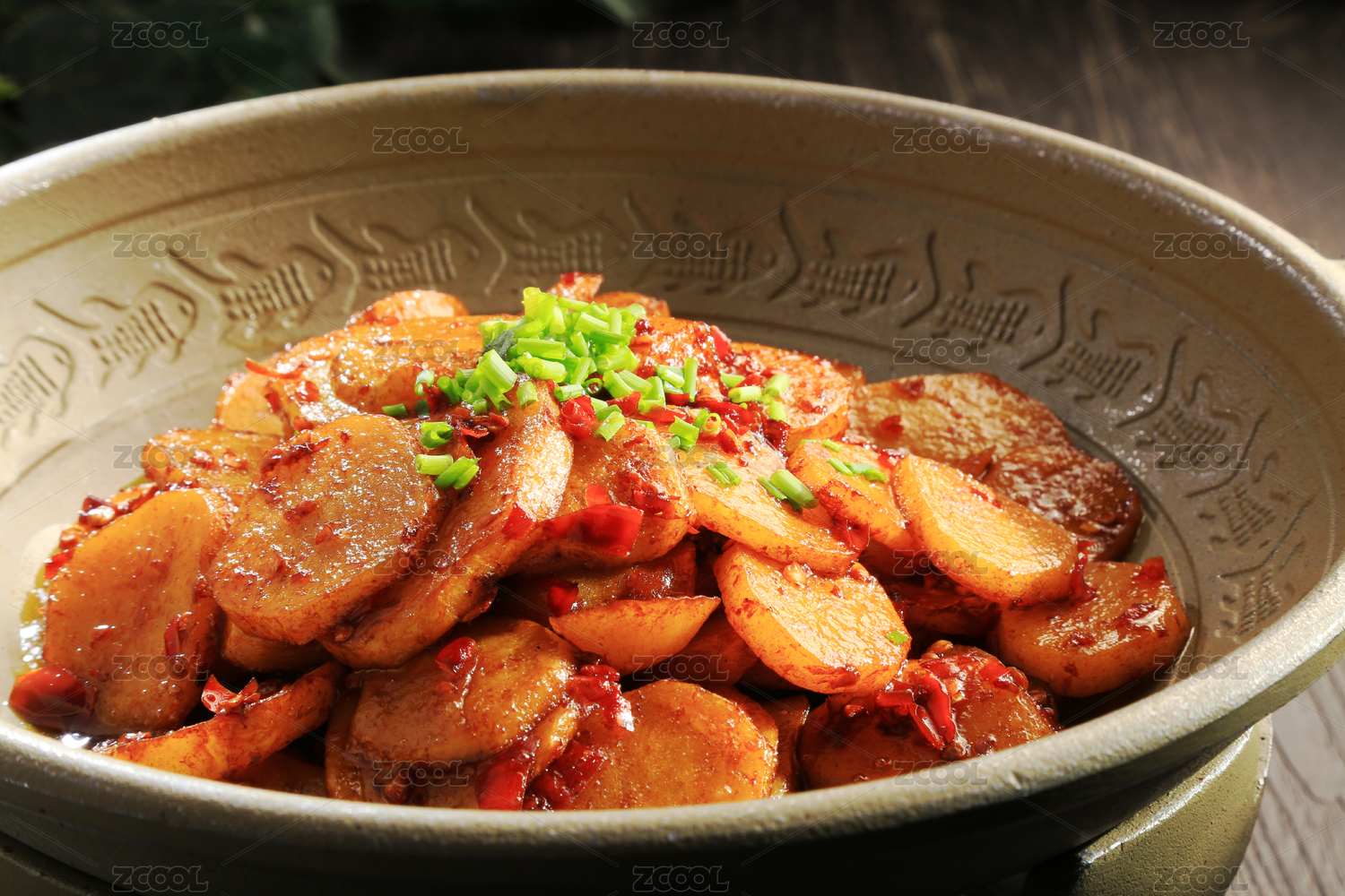 木板上土色陶瓷鍋里的干鍋土豆片,點綴著蔥花