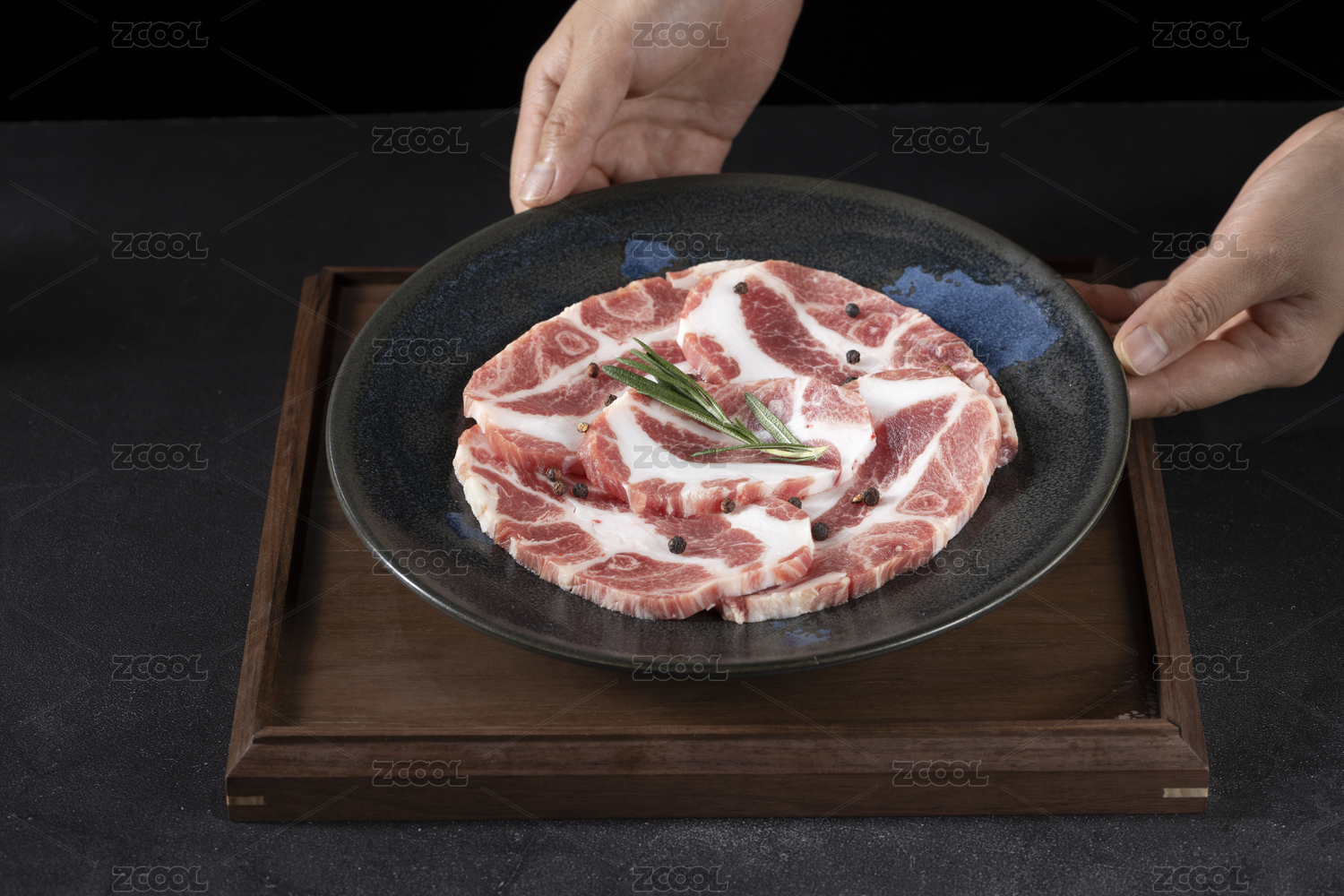 日式盤(pán)子里的燒烤烤肉料理食材生切豬頸肉
