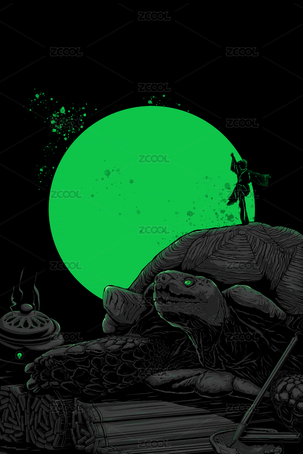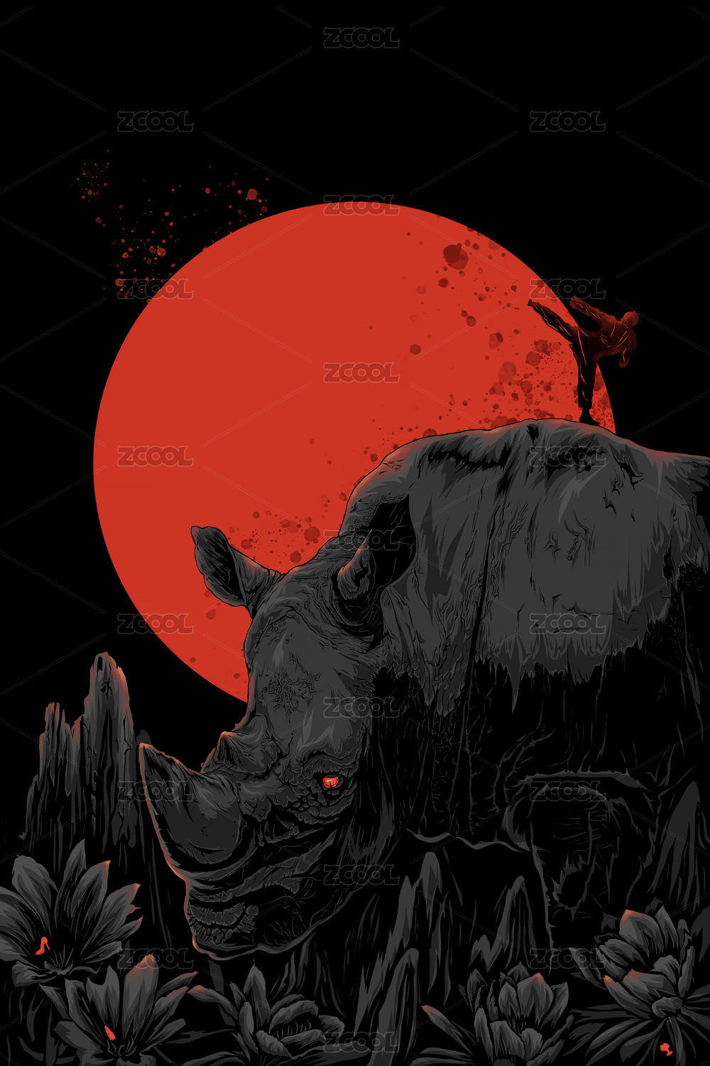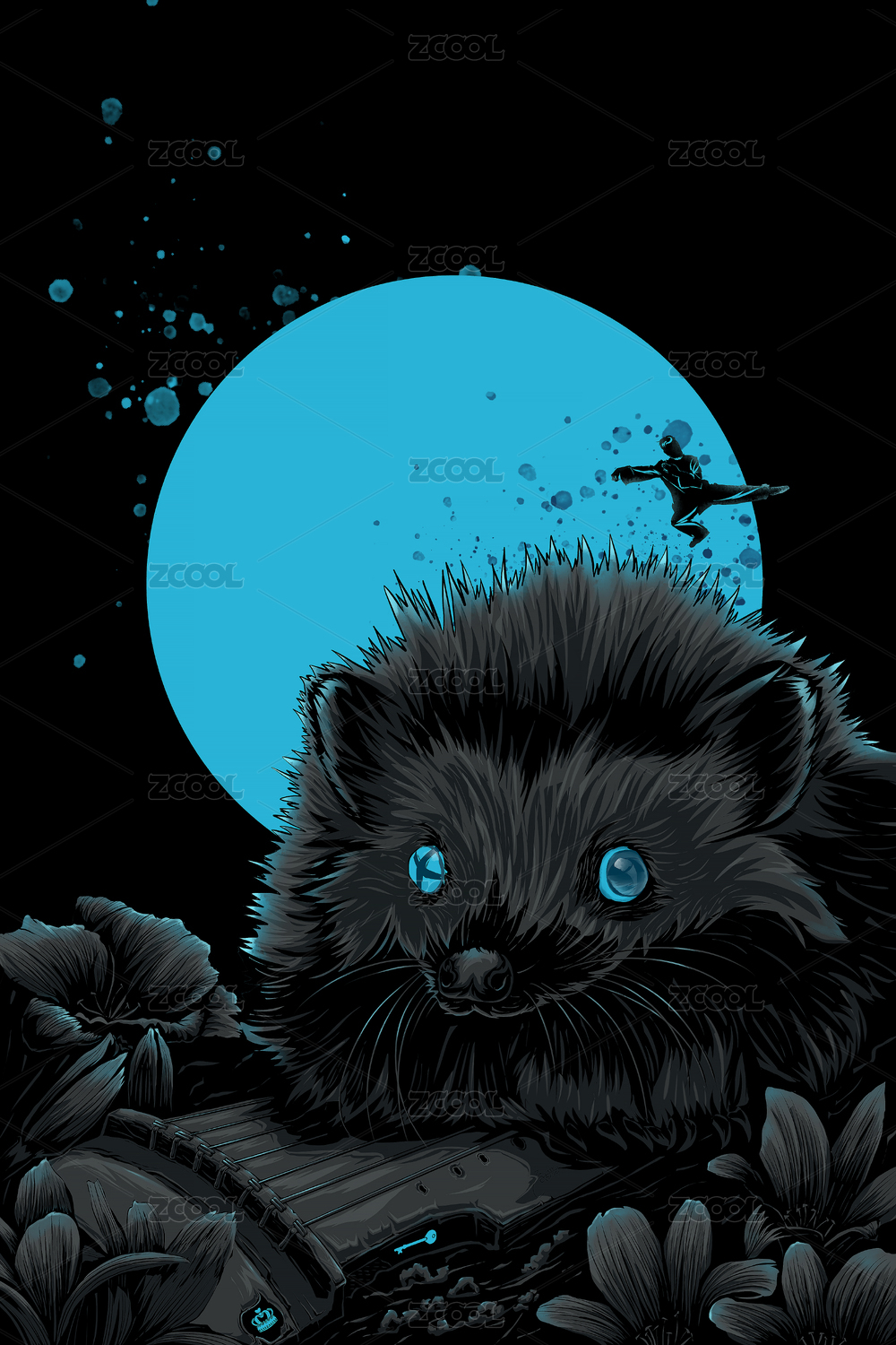 黑色背景里的武術(shù)人 刺猬、古箏和花朵