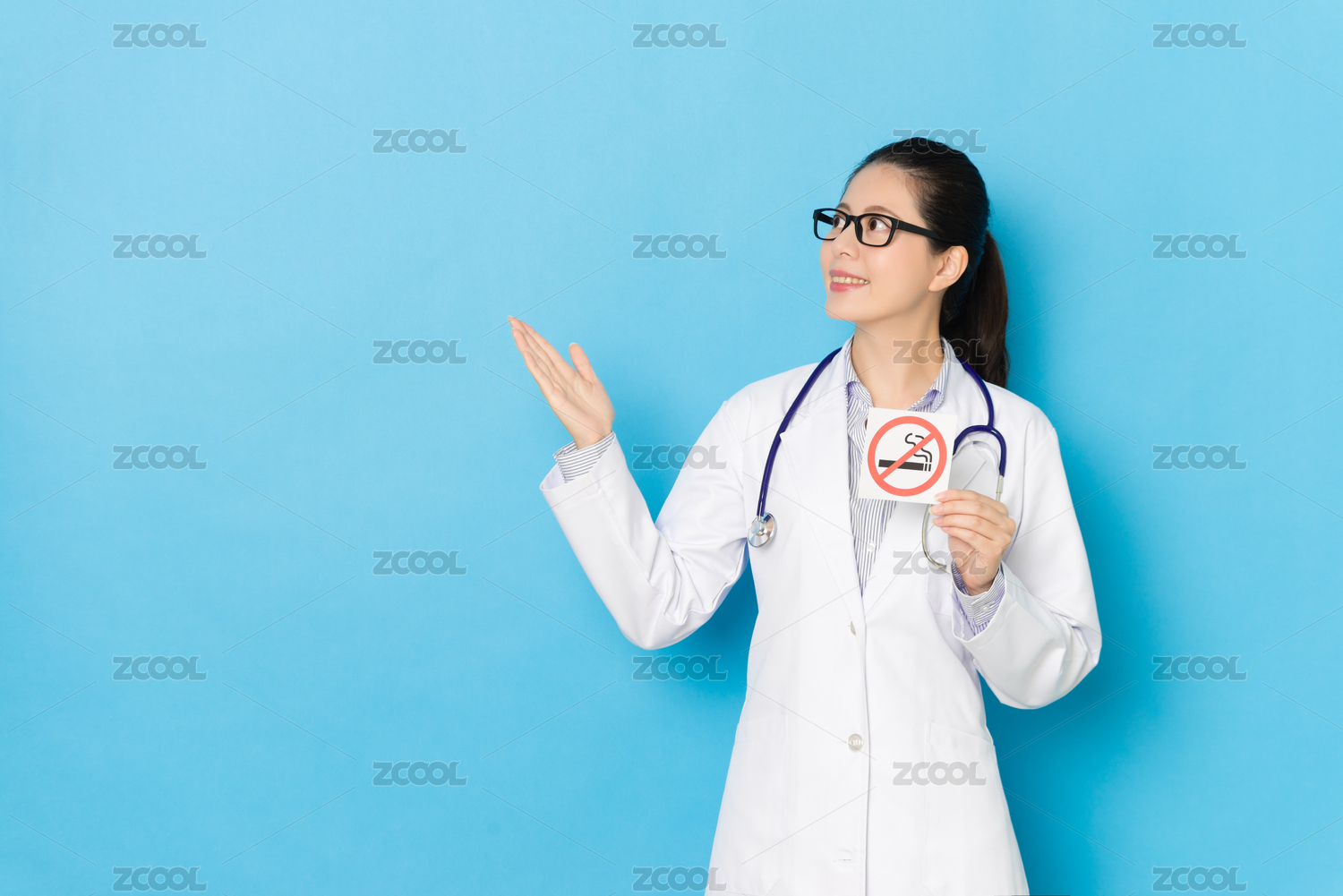專業(yè)漂亮的女醫(yī)院的醫(yī)生讓呈現(xiàn)的姿勢和孤立顯示藍(lán)色背景上的禁止吸煙標(biāo)志的標(biāo)志。