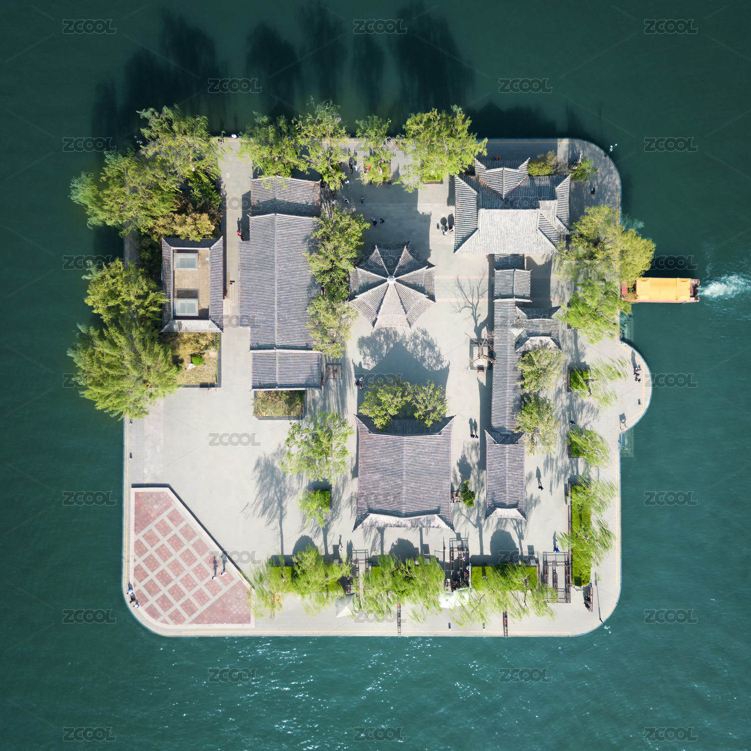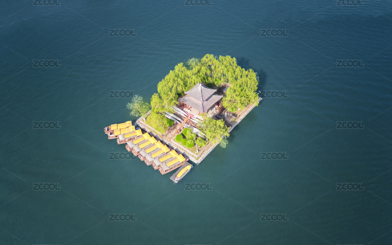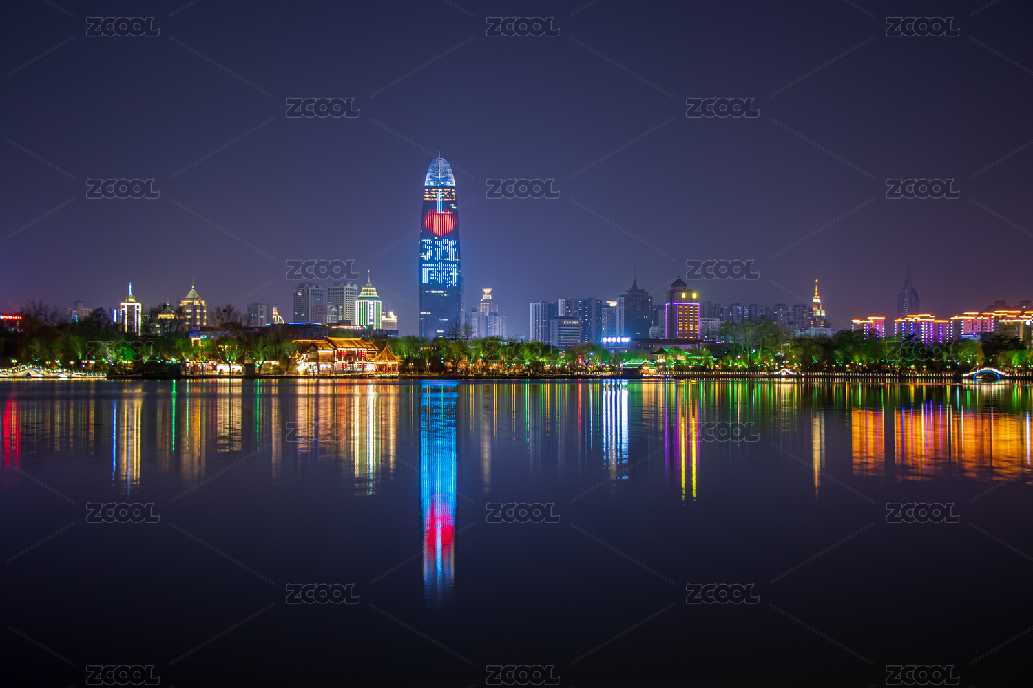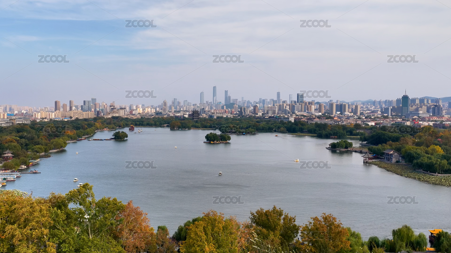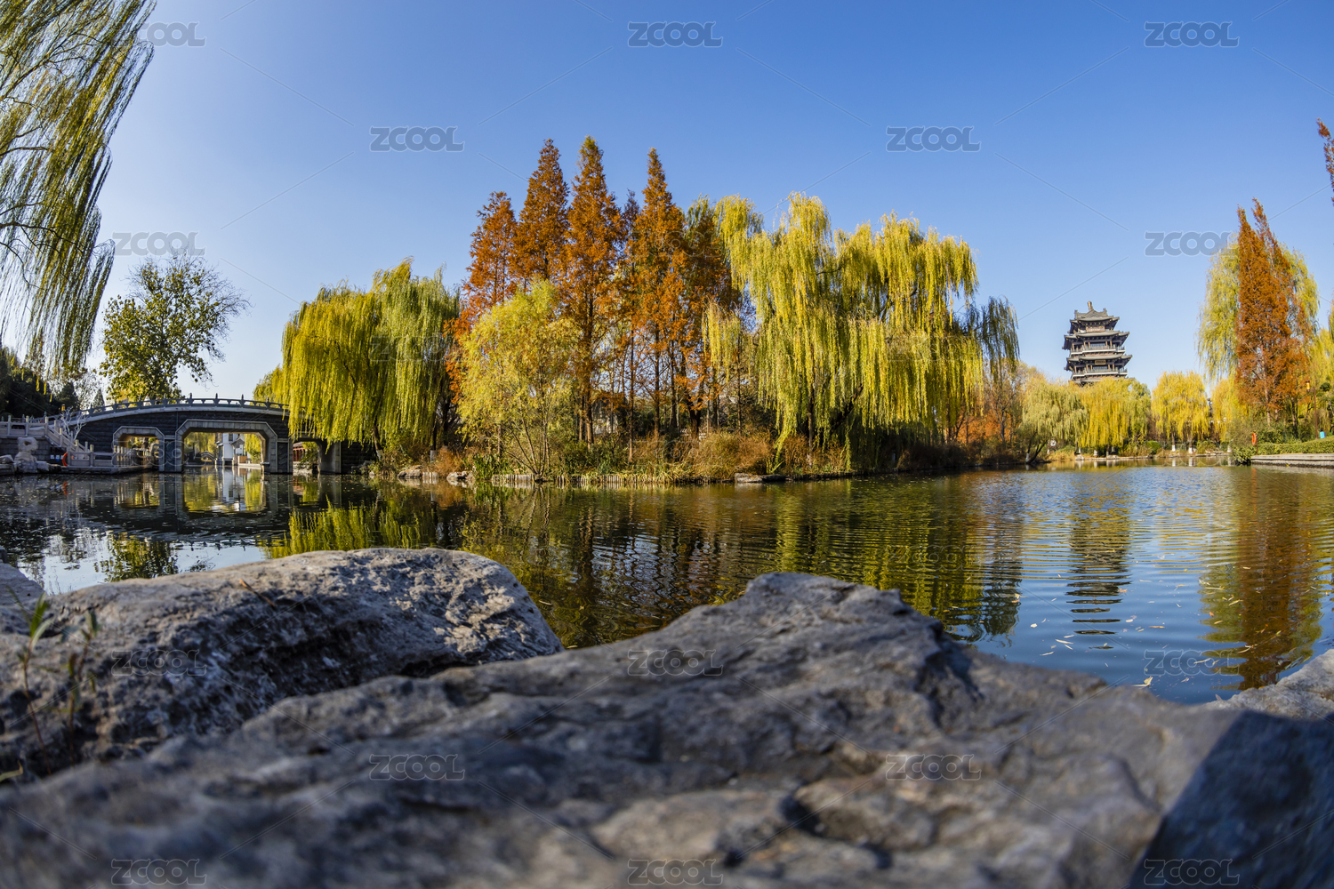 山東濟(jì)南大明湖夕陽(yáng)倒映景觀