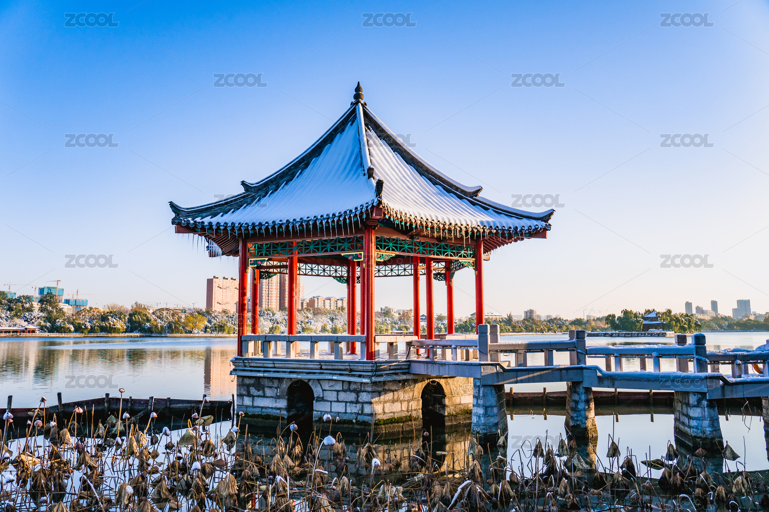 中國(guó)山東濟(jì)南大明湖景區(qū)九曲亭雪景
