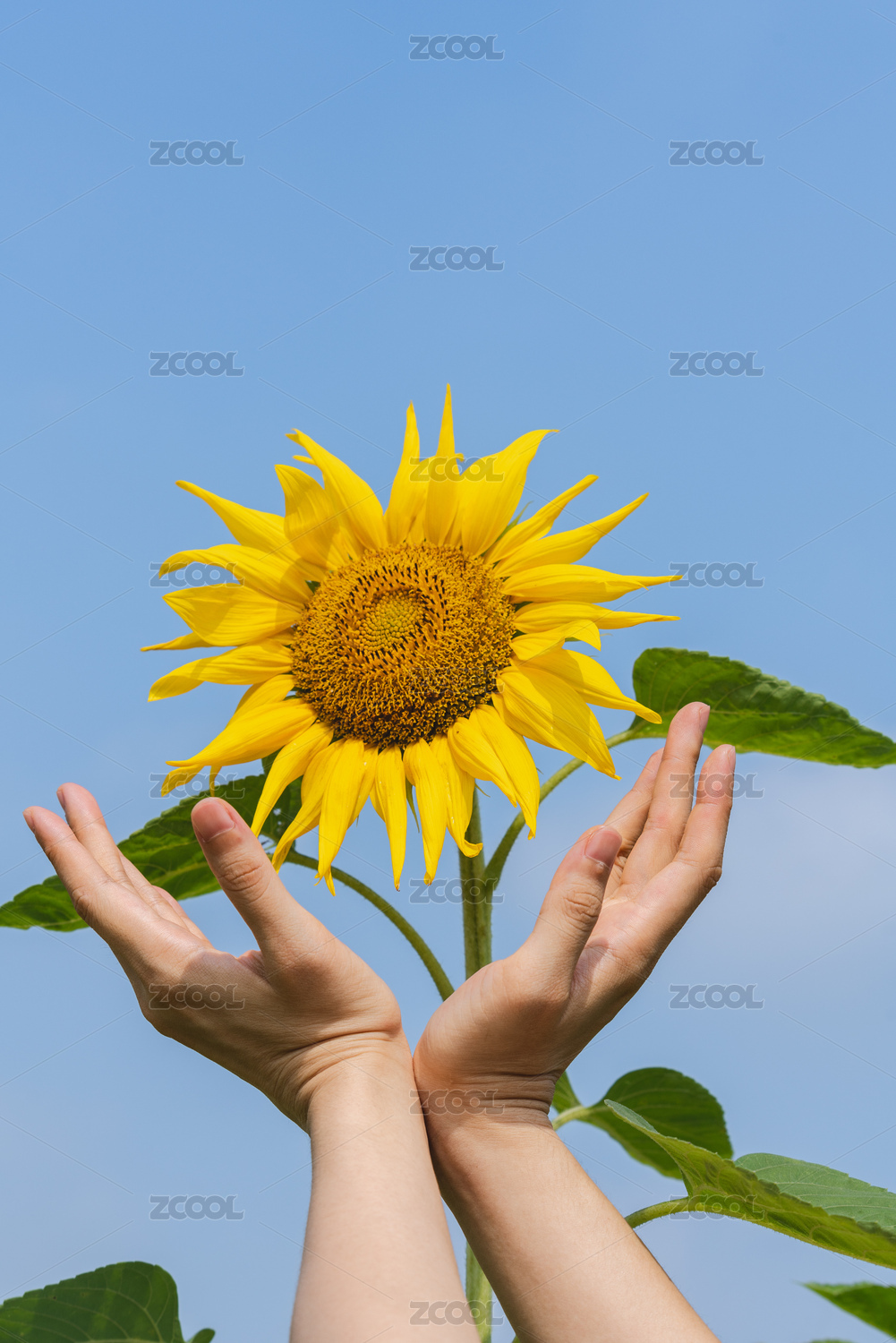 一雙手在呵護在藍天下盛開的向日葵