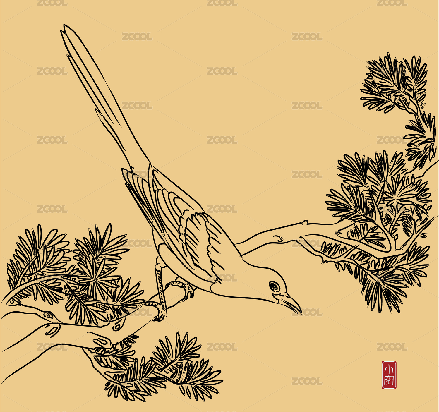 喜鵲工筆白描矢量線稿畫