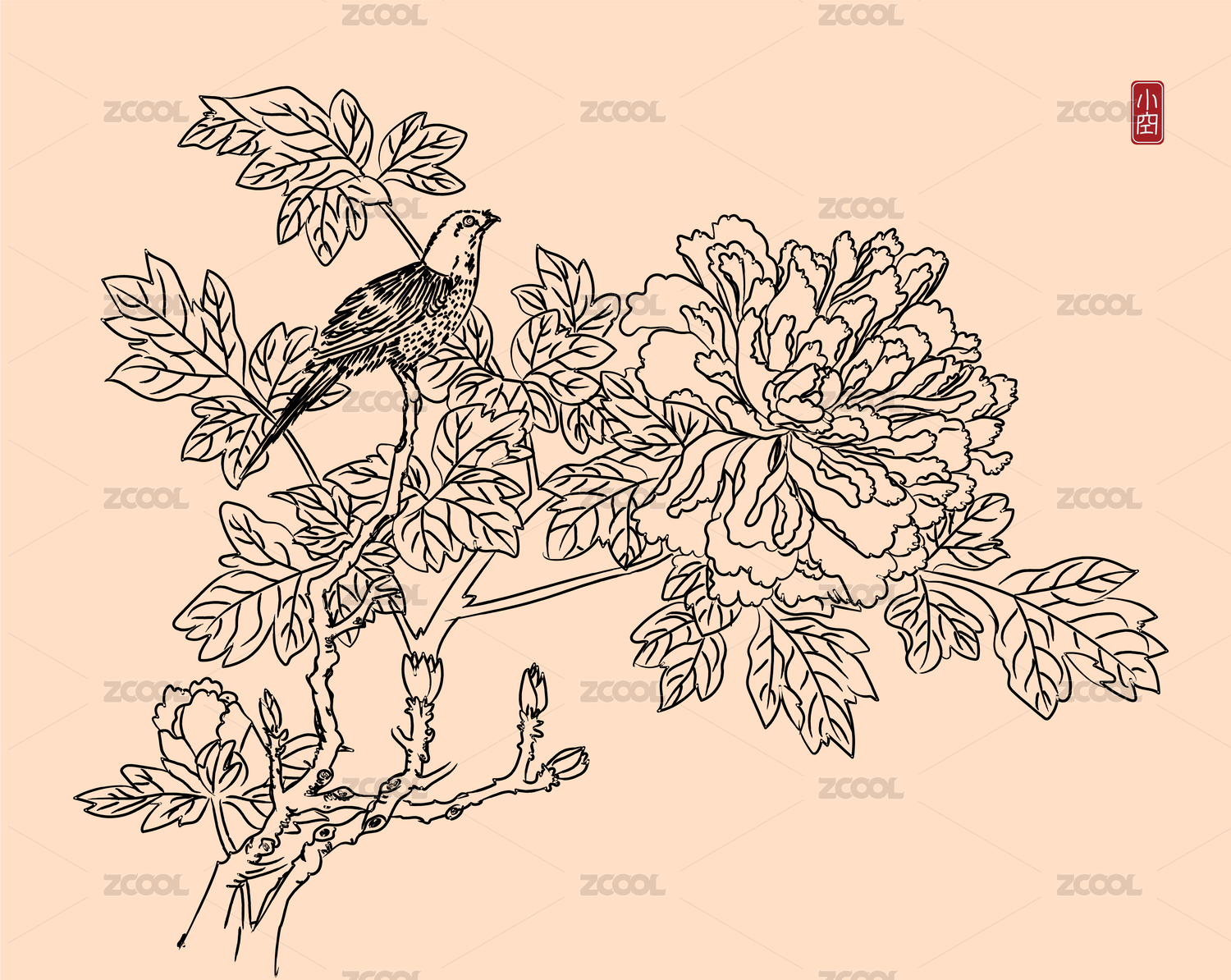 花鳥牡丹工筆白描矢量線稿手繪