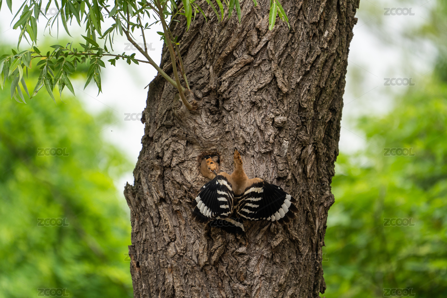樹(shù)洞口一只戴勝親鳥(niǎo)在給小鳥(niǎo)喂食