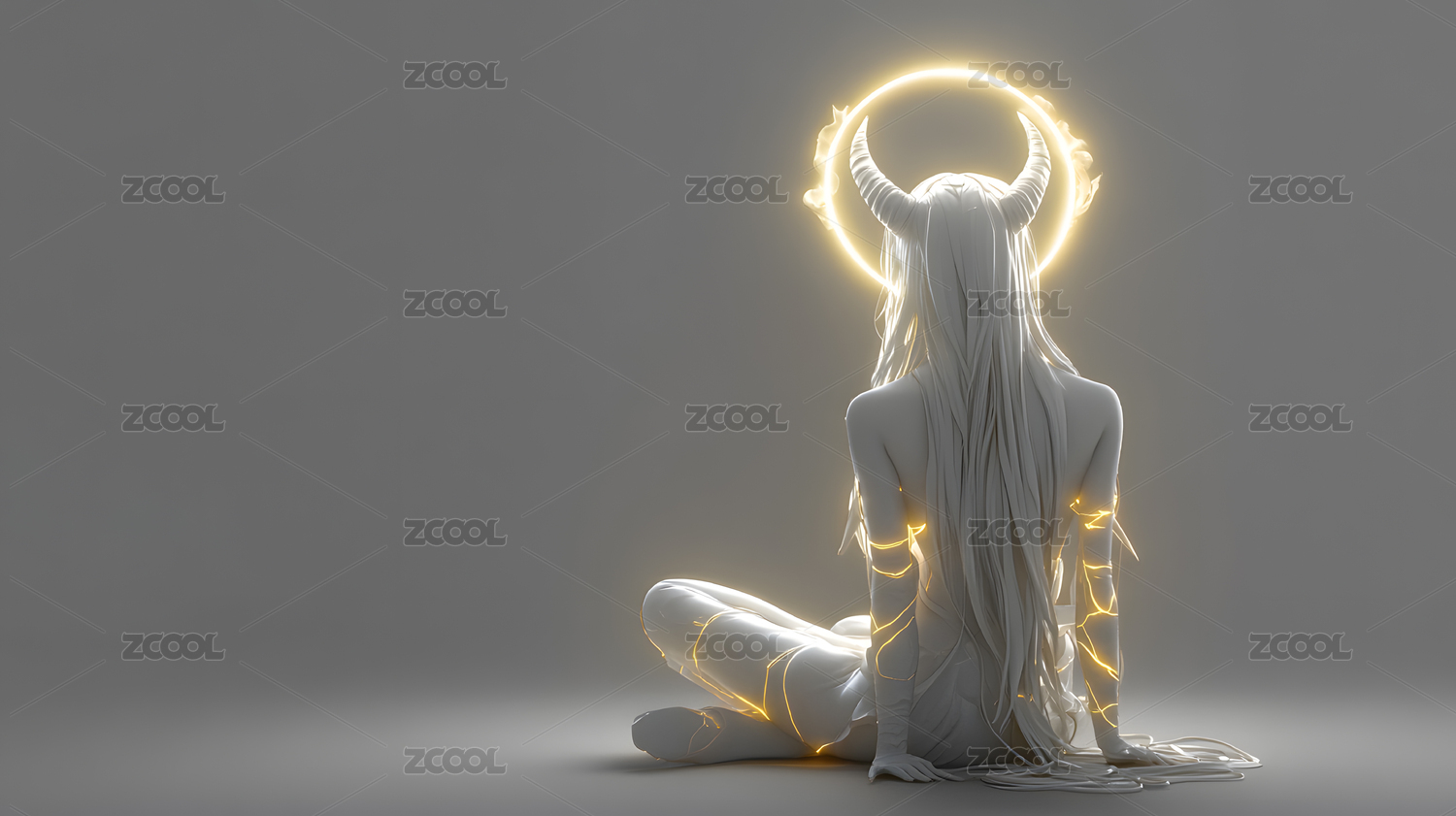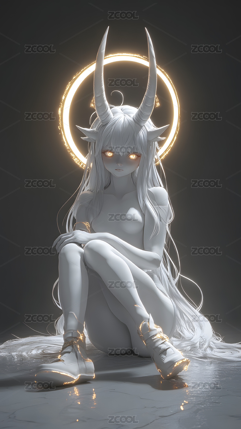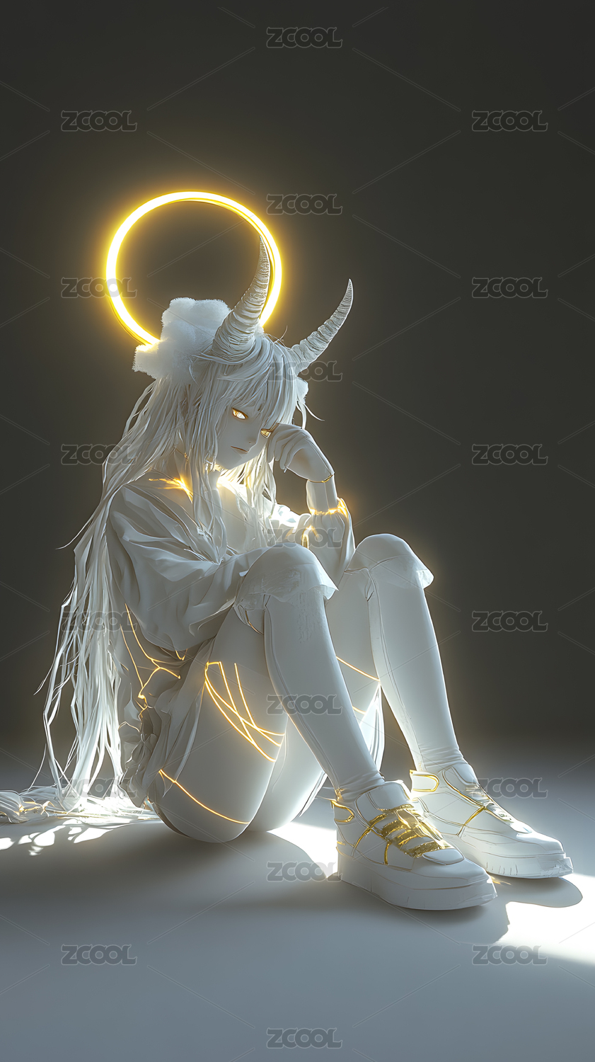 光環(huán)下的白發(fā)惡魔女孩3D渲染圖