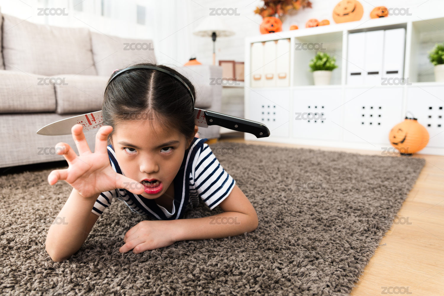 恐怖女孩扮演的殺人游戲放在她頭上一把刀,并成為惡魔嚇得人爬在客廳的地板上。